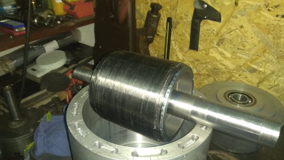 Tak som to nejako namotal, všetky vodítka, čo som vyrobil mi to vlákno trhali. Nakoniec som vodítko musel spraviť z kože a predpätie som robil rukami. Po namotaní som to nechal točiť a prebytočnú živicu som posťahoval plastovou špachtľou. Nevyzerá to bohvieako, ale mohlo to dopadnúť aj horšie. Hlavne že je to namotané rovnomerne, kontroloval som to hodinkami a hádzavosť to má max. pár stovák. Hrúbku som dal 0,5mm, tak dúfam, že to vydrží. Vytvrdzoval som to 3 hodiny pri 100°C.