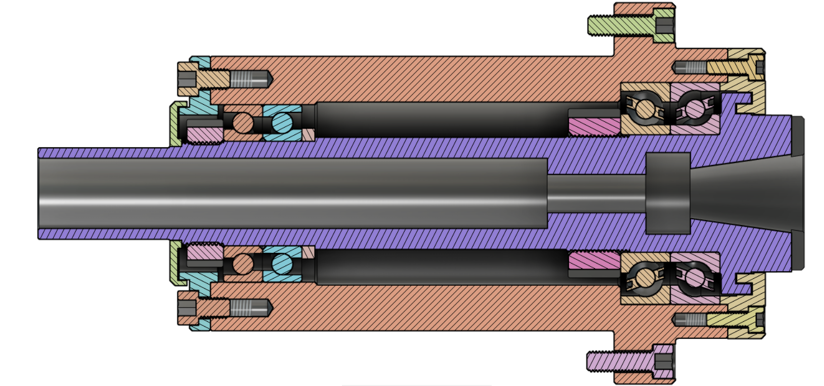 Držák bych chtěl nechat odlít z litiny 422425 a následně obrobit. Tubus bych vyrobil asi z 12050 a nebo 11523, ještě nevím. Hřídel bych viděl na 14220 a nebo jinou cementačku + kalit kužel a plochy pro ložiska. Díru v hřídeli ještě nevím a nemám ji přesně zakreslenou, musím počkat až mi z číny přijede mechanizmus upínání + talířové pružiny a pak ten model přizpůsobím. Ložiska jsem zvolil s kosoúhlým stykem, ze strany od upínacího kuželu pevně a ze strany řemenice budou v tubusu uložené volně aby mohly mírně axiálně pochodovat vlivem tepelné roztažnosti. ze strany od řemenice jsem zvažoval i jehlové nebo válečkové ložisko, ale tam by byl problém s vymezením radiální vůle.