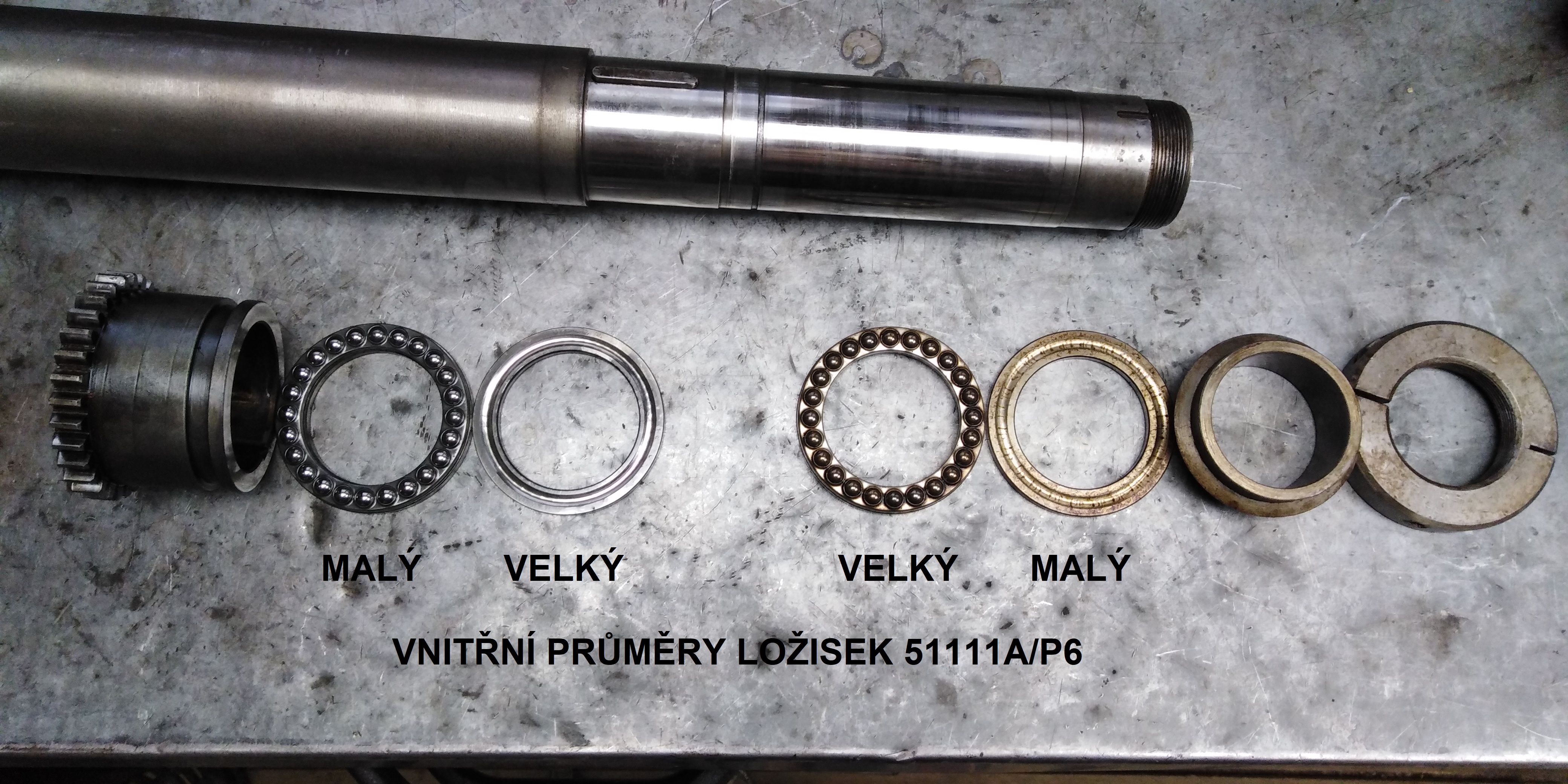 Opět bych se pozeptal a to na montáž axiálních ložisek. Ložisko 51111a/p6 má dva rozměry kroužků. Předešlý majitel je namontoval ve sledu viz.obrázek. Podle mě jsou správně protože větší kroužky směřujou z obou stran k vložce vřetene a tím že mají větší rozměr korigují případnou vůli vřete ve vložce. Jinak mě opravte jak tedy. Případně že dáváte jiné. Děkuji za rady. rkr.
