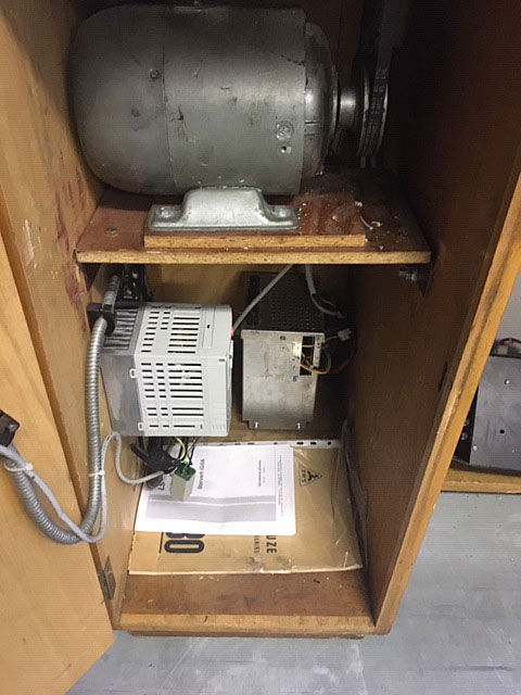 230V mám v původní ocelové chráničce, a zbytek je jenom ovládání 12V a to neřeším. Bohužel původní plechový origo kryt se dovnitř nevešel. Hlavním vypínačem zapnu světlo, frekvenčák, odměřování a řízení. Směr otáčení funguje jako u původního motoru + je tam potenciometr na otáčky. Na té řídící kravce vpravo je i displej otáčkoměru, ale ten začne ukazovat až od 10 ot/min.