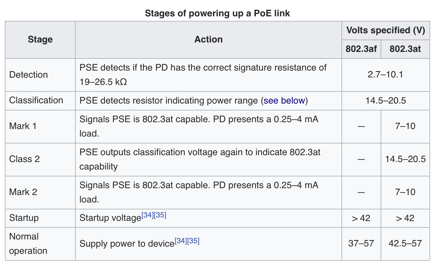 Pokud je to dle normy 802.3af/at, tak je třeba handshake. Funguje to zhruba tak, že zdroj dodává nějaké napětí, a měří zátěž. Klient podle normy má v tomto režimu nějakou definovanou impedanci. Pokud to tak je, tak zdroj zvýší výkon, a zase testuje. Klient opět připojí nějakou jinou impedanci. Pokud i tohle kolo proběhne, tak teprve potom pustí zdroj plné napájení.