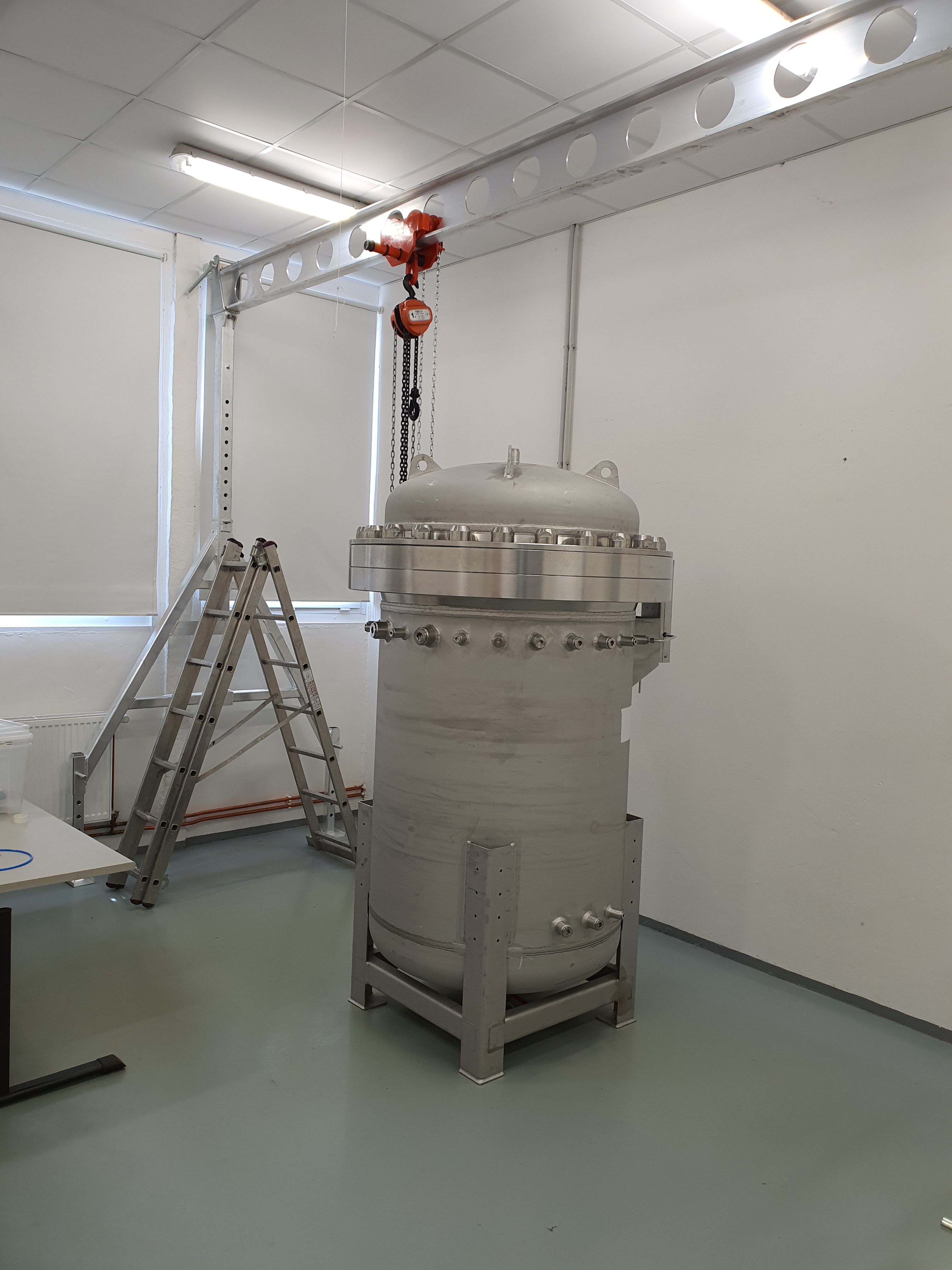 Z té nádoby se musí sundat víko, má 600 kg, a dát někam stranou. Pak dám dovnitř zkoušený přístroj a víko zase přiklopím. Musí se spouštět pomalu a nasadit přesně na čepy. Ten ruční kladkostroj který tam je vyfocený je úplně nepoužitelný.
