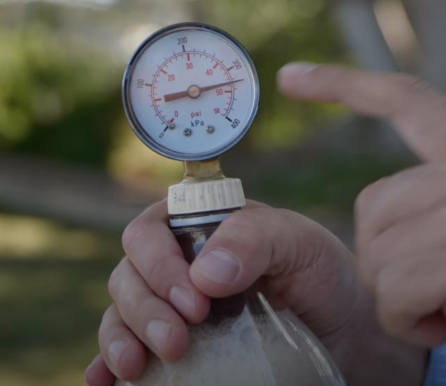 Na začátku pokusu namontuji tlakoměr na lahev - tedy ji otevřu a tlak nad kapalinou ztratím, v kapalině je ale stále rozpuštěno dost plynu - po určité době se lahev "natlakuje" postupným uvolňováním plynu z kapaliny a přejde to do rovnovážného stavu - zatřepáním to jde urychlit.