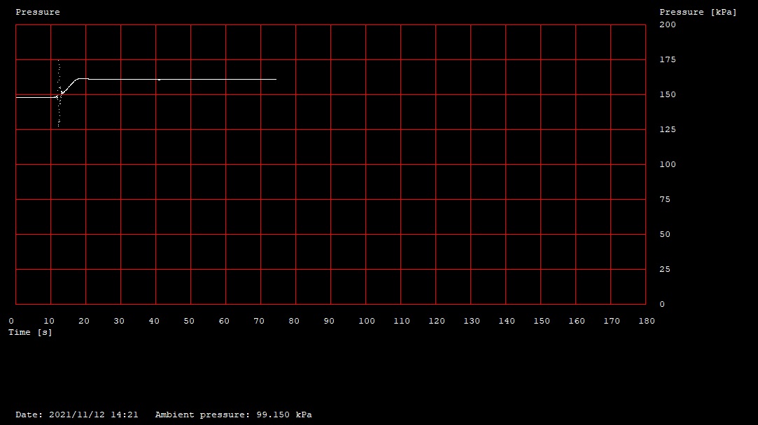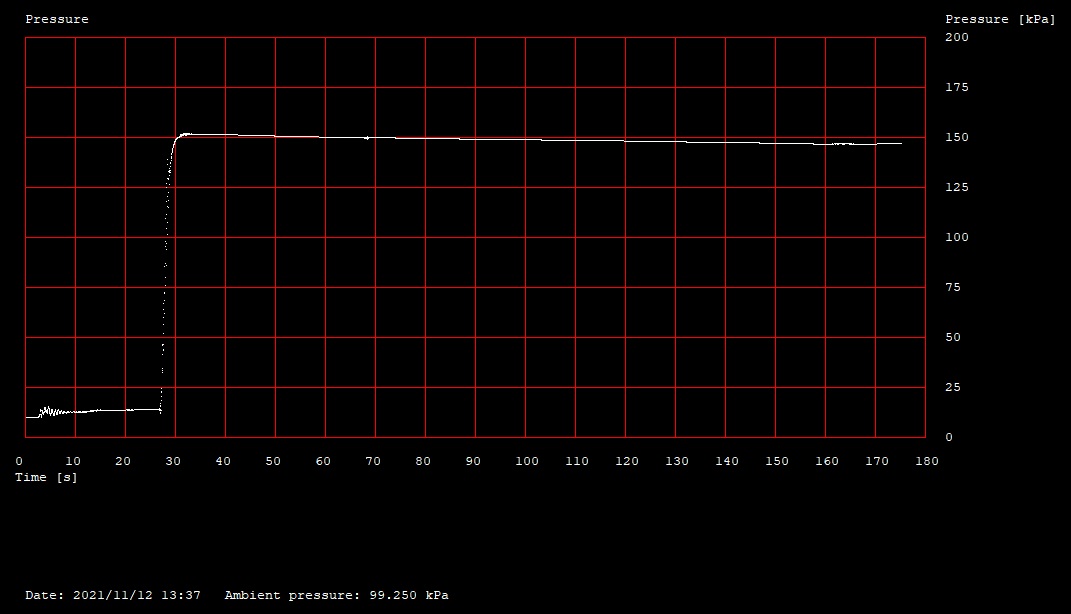 Délka připojovací hadičky je 1.5 m, vnitřní průměr 4 mm, naplněná destilovanou vodou + těch asi 30 cm nad ventilem + plně otevřený jehlový ventil. Normálně by neměla mít pozorovatelný vliv, na manometru je vidět i kdy jsem se prsty dotkl láhve, o třepání nemluvě. Tlak se snímá 50x za vteřinu.