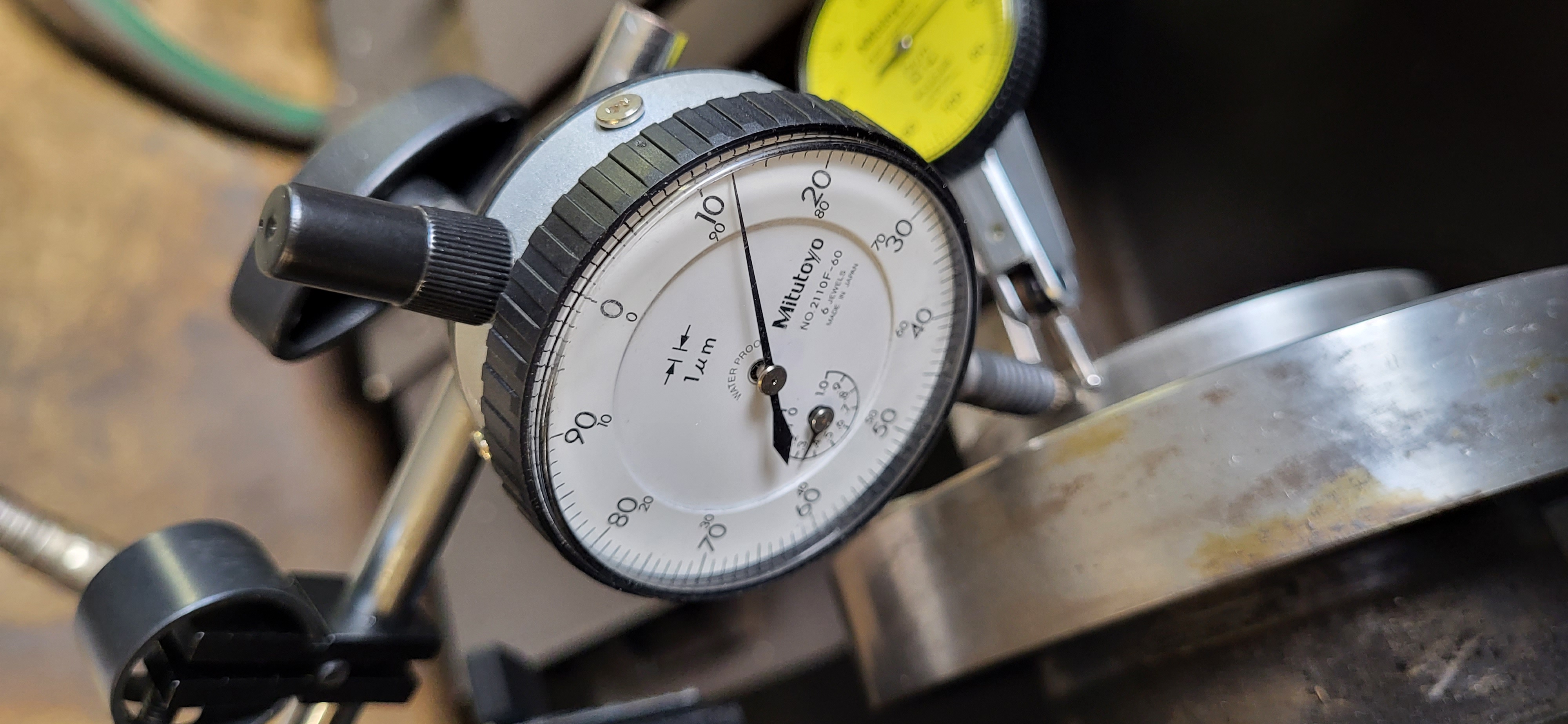 Tak mi to nedalo a vzal jsem druhé stopky. A dobrá zpráva asi je, že jsem se spletl o desetinou čárku, takže by házení bylo v rámci 2tisícin, blbá, že jsem vůl. Já to měřil na těch žlutých původně a myslel jsem, že jeden dílek je 2um..? Ale u tohoto měřidla je to tak, že od čísla k číslu jsou 2um?? Tzn 10 dílků po 2 = 2um. Já vždy myslel, že co je psané na budíku odpovídá jednomu dílku na velké ručičce. Když postavím oboje stopky vedle sebe, tak jedny ukazují 2 dílky (ty bílé), tedy 2um, ty žluté ukazují úchylku 10 dílků, pokud jeden dílek jsou 2um, pak by to mělo být 20um.