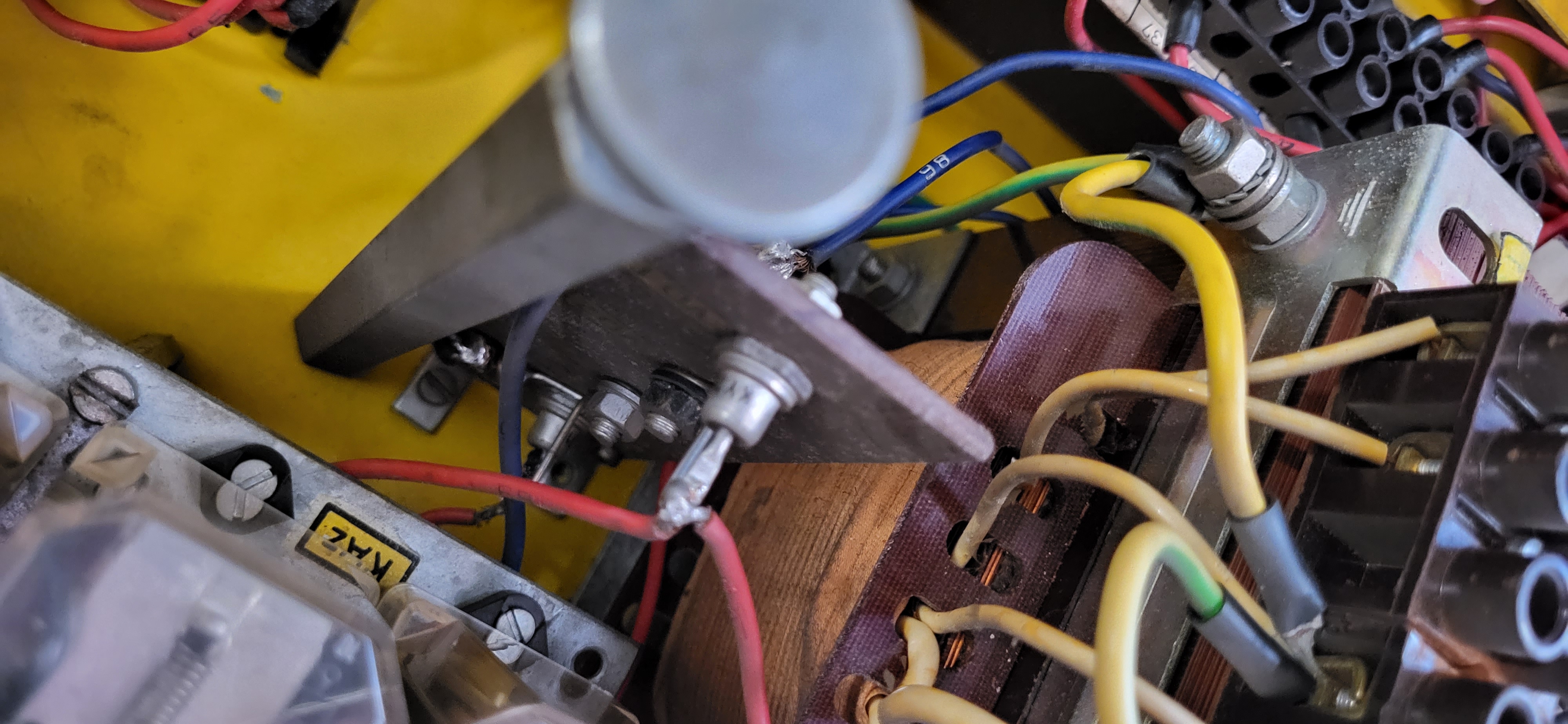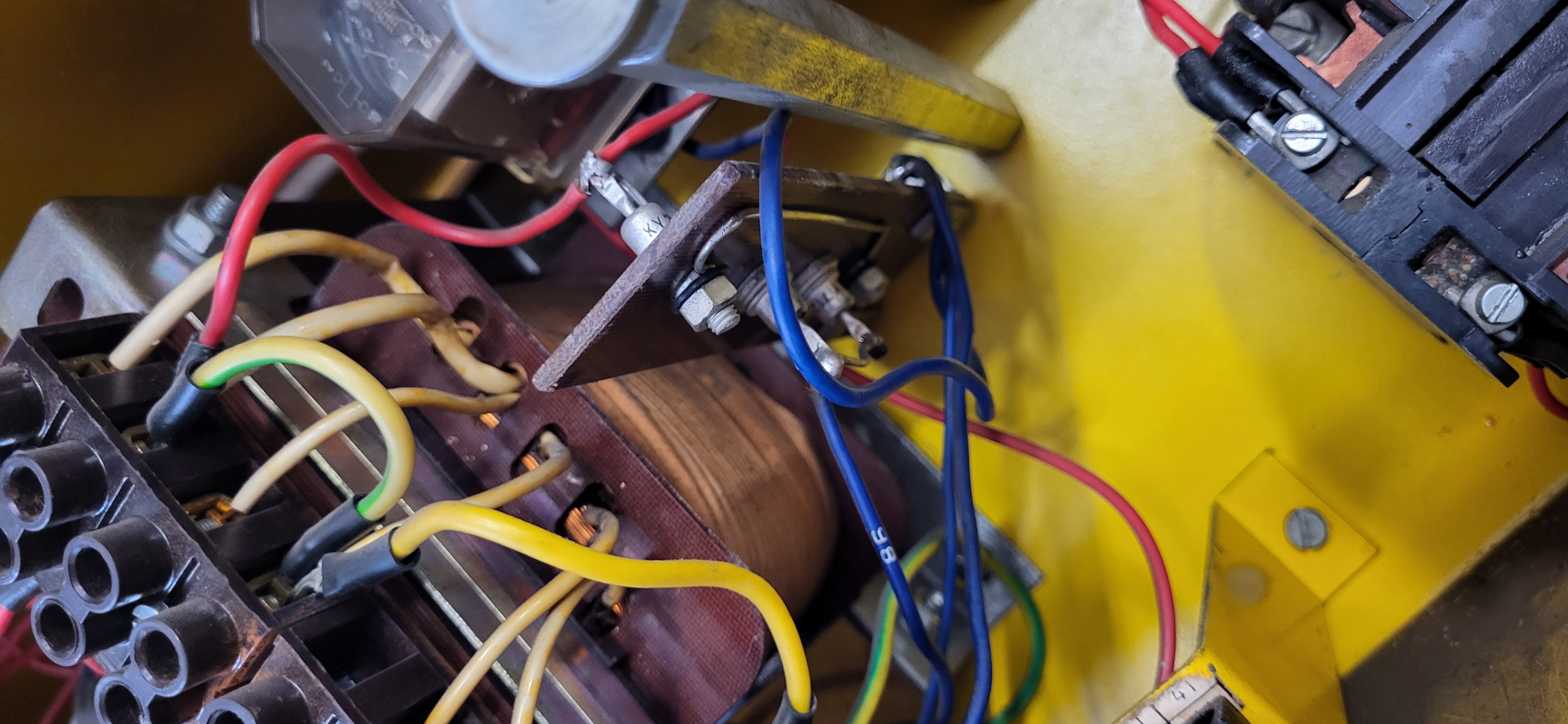Nepustil no, v elektrice je nějaký problém. Respektive pustil, mechanicky pres stykač, běží krásně tiše. Motor posuvu i motor čerpadla emulze taky chodí. Dle mého je vadný diodový můstek. Neporadi někdo, jak ho jednoduše otestovat? Z trafa jde stridavych 24V, ale nikde jsem nenaměřil stejnosmernych 24V. Tím pádem pak nejdou asi ovládací relátka nebo nevím, budu ještě bádat. Schéma, co je na tumlikovo je na starší typ, takže je to trochu jiné. Ještě priložím foto můstku.