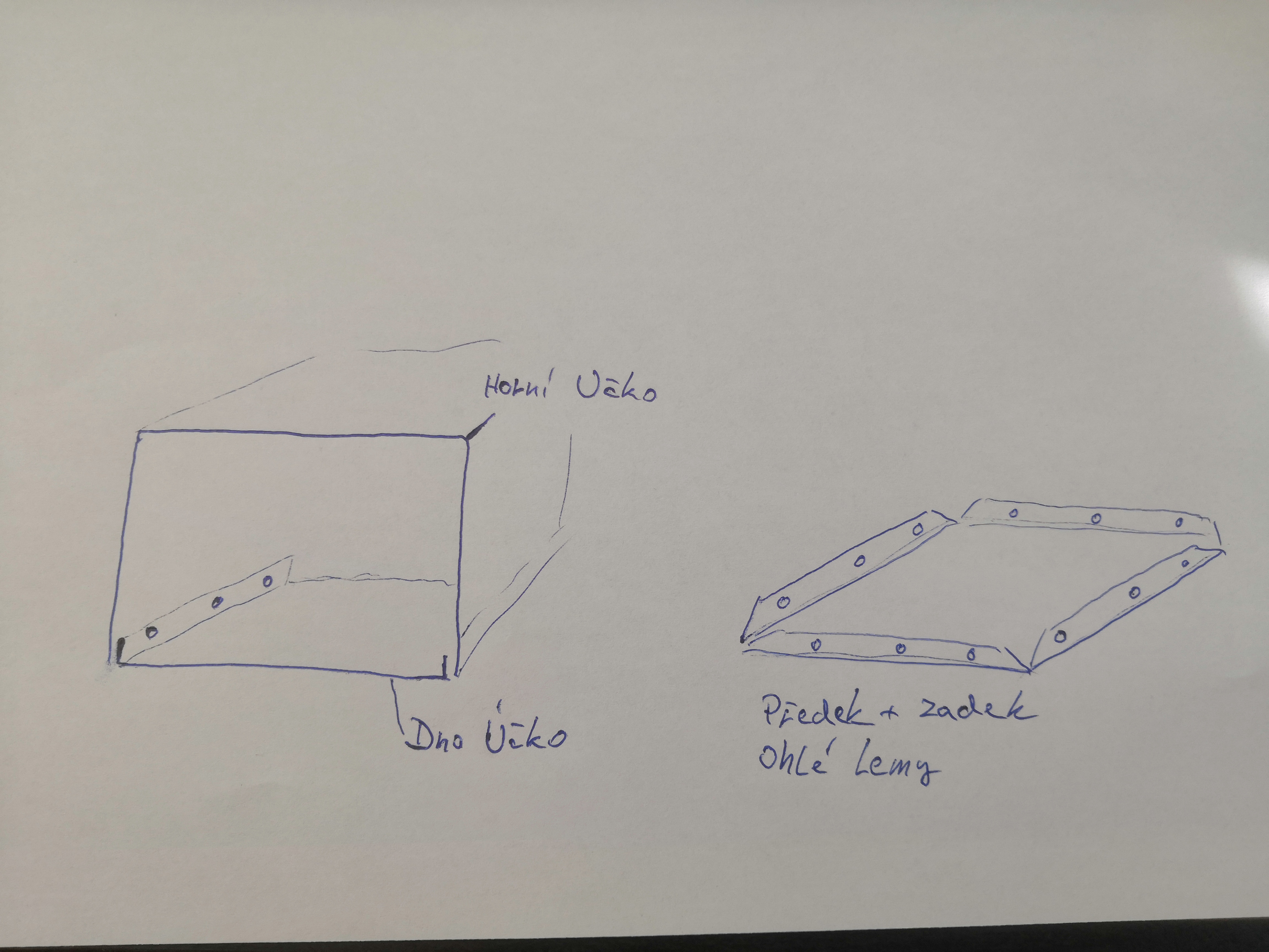 Z té fotky nevidím jak je to uspořádané. Je to spodek ohnutý do U, kryt do U (potkají se uprostřed, nebo je spodek jen deska a kryt sahá až dolů?) a přední a zadní panel se čtyřmi lemy dokola? Taky by se dal ten spodek udělat v jednom kuse i s předním a zadním panelem a přes to dát překryt do U. Ještě budu potřebovat vědět přesah vpředu a vzadu (jak je ten panel zapuštěný resp. o kolik přesahuje "stříška") a pod jakým úhlem je to vpředu zkosené. Dál větrací otvory, jaké díry pro nožičky, pro přišroubování toho trafa a tak, ale to se dá udělat v druhé iteraci až bude základní výkres.