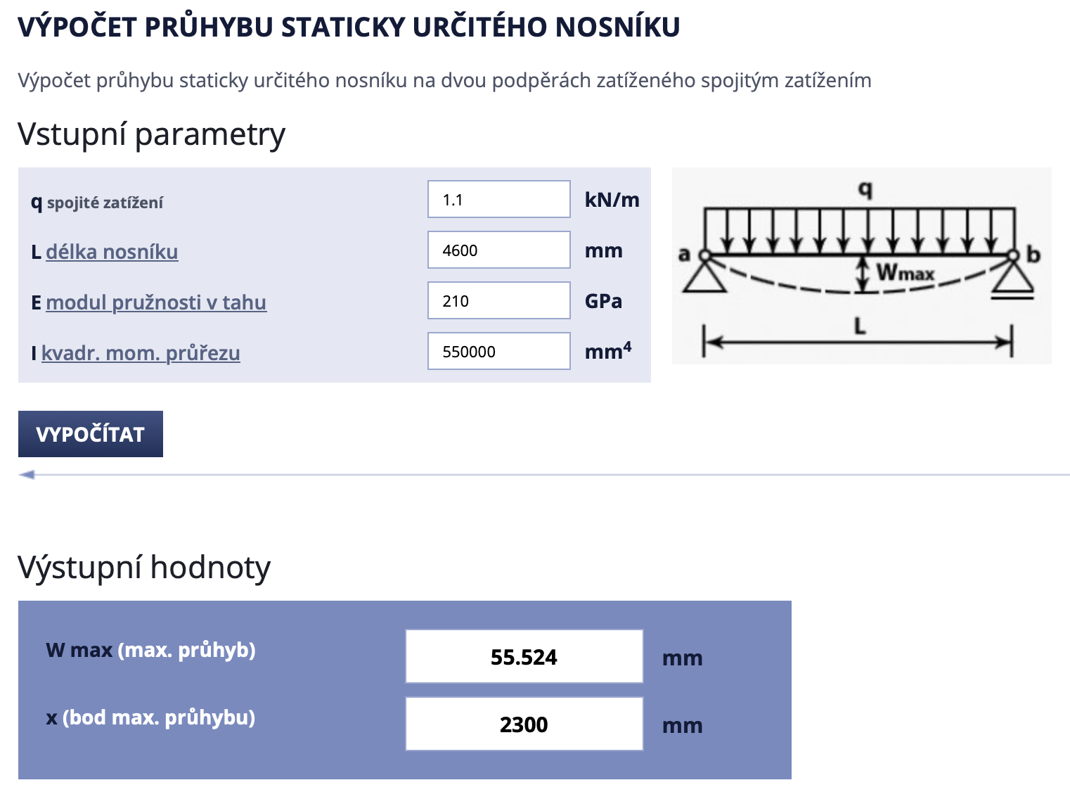 UPN140 má zde horizontální I zhruba 550000mm⁴. Tu tunu myslíš po celé délce? Rozloženou do obou bočníc nebo do jedné? A není to nějak moc (je to víc, než jsi doporučoval počítat vertikálně)? Pokud tedy zadám q = 10000 / 4.6 / 2 = 1.1 kN/m, vychází to takto: