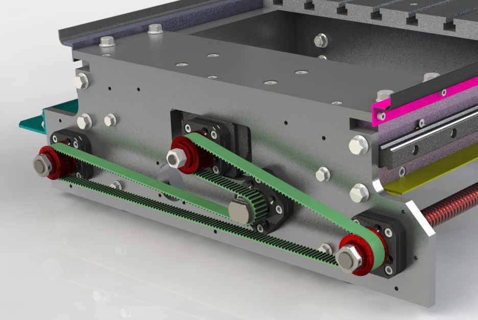 No a protože oproti původnímu návrhu s motorem 2Nm na Y je tam teď 4Nm, tak dojde ke změně v projektu. Změní se převod do pomala v poměru 1:2 na 1:1. Je to také zejména z toho důvodu, že síla potřebná na otáčení a pohyb osy Y je opravdu dvěma prsty. Ručičkový momentový klíč skoro nic nezaznamenal. Trochu byl oříšek najít polohu pro kladku se zachováním již koupeného řemenu 1200mm. Budou muset být tři nové řemenice HTD 5M-22Z, už jsou objednané, kladka zůstane původní. No a výsledek přikládám zatím jen ve vizualizaci.