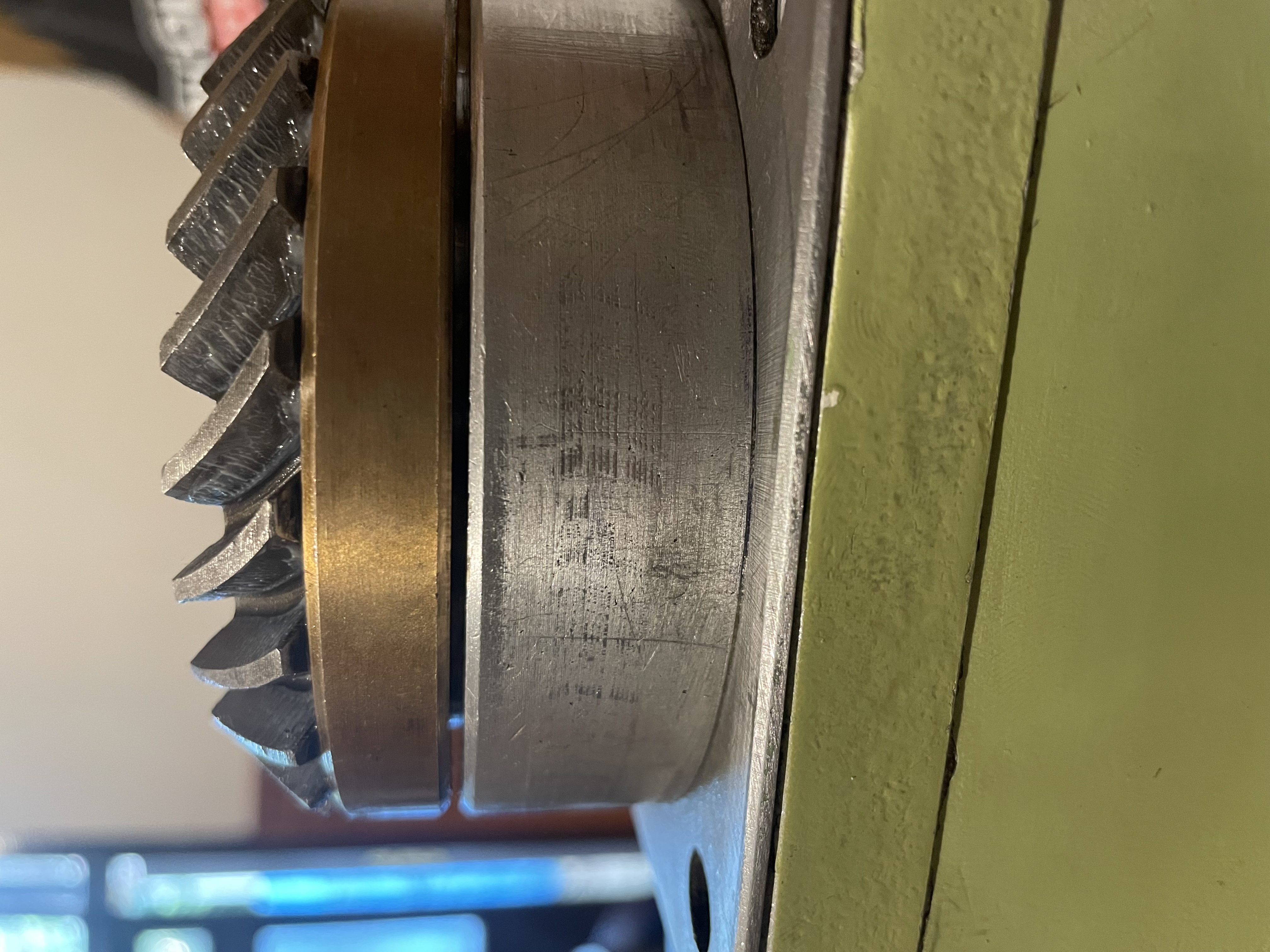 Okometricky je při pohledu od spodu, otvorem pro pinolu, všude stejná zubová vůle. Čela kol na sebe krásně navazují, ani jedno kolo mi nepřijde níže / výše. Nezdá se mi že by kola šli na dno zubové mezery. Zkusil jsem udělat bližší foto záběru kol.