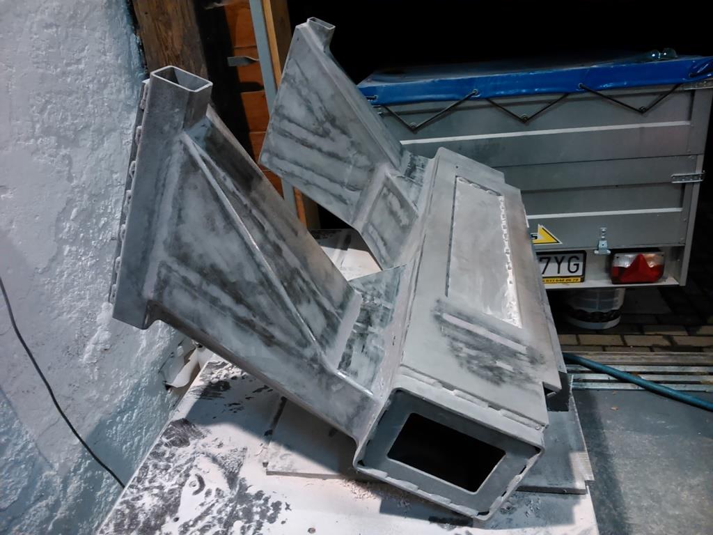 Žíhanie sa podarilo úspešne vybaviť (veľká vďaka členovi PBr). Bolo to síce dosť drahé, ale zasa v porovnaní s ostatnými nákladmi je to kvapka v mori. Po žíhaní zvarence šli hneď na pieskovanie. Nasledovalo liatie, tmelenie a základovka.