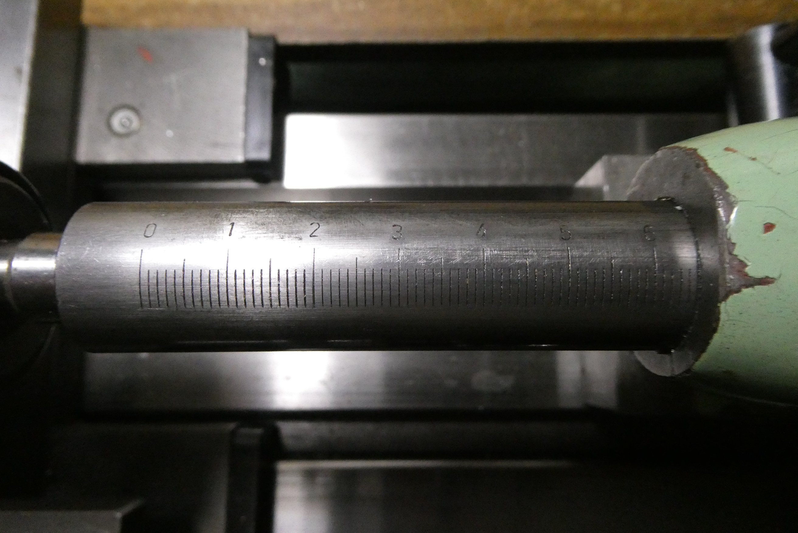 Ještě vzorek použití: na pinolu pákového koníku jsem si vyryl stupnici a délku rysek a jejich počátek jsem nastavoval s pomocí dělicího kotouče na vřeteni.[img]