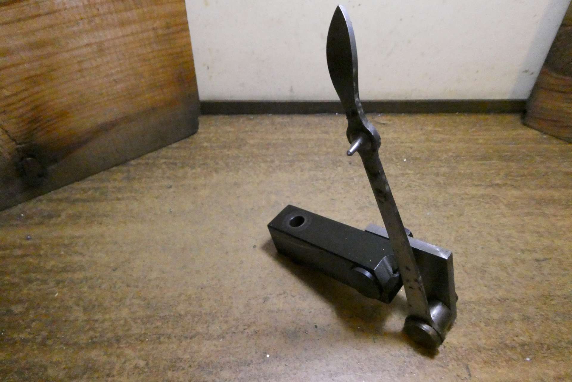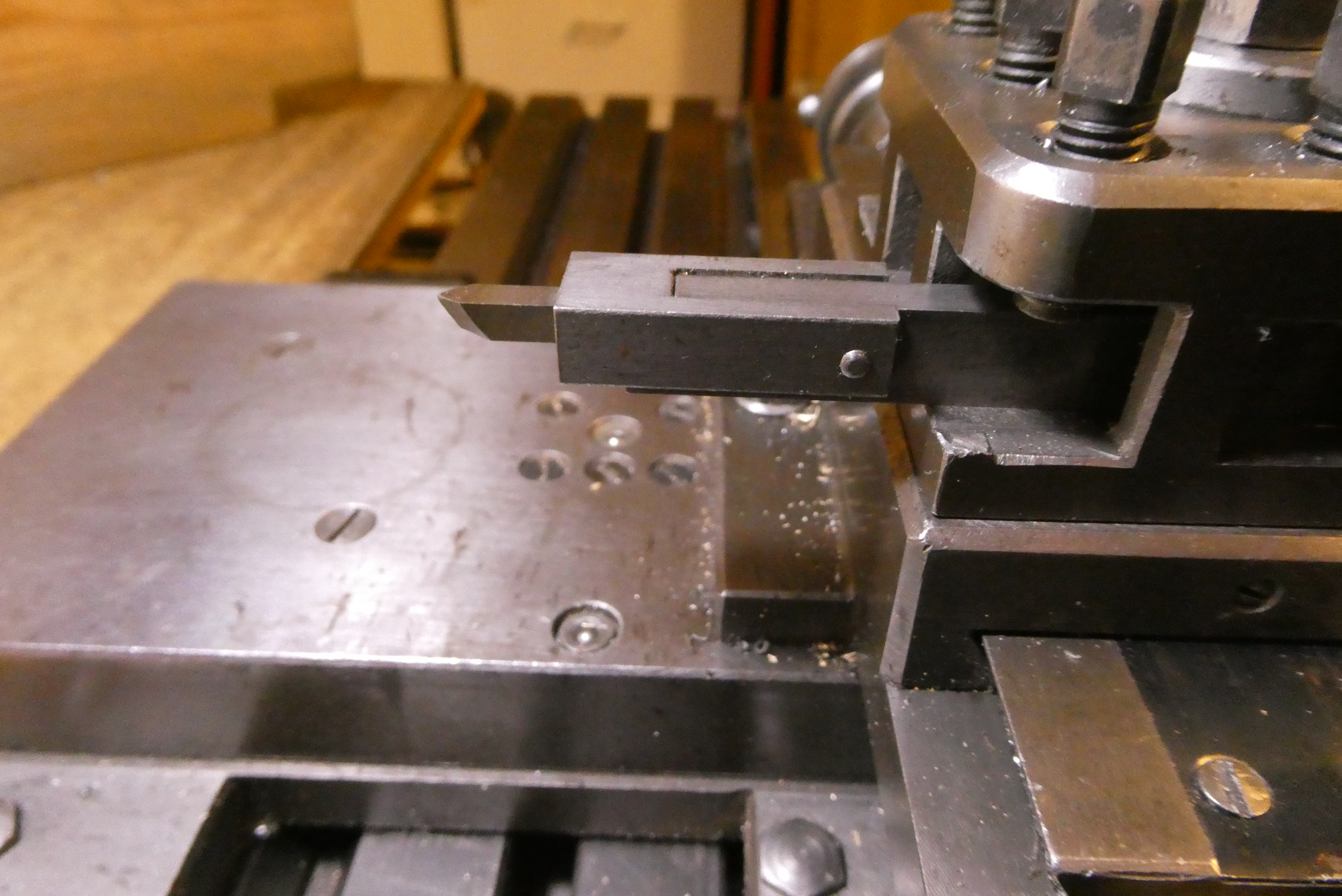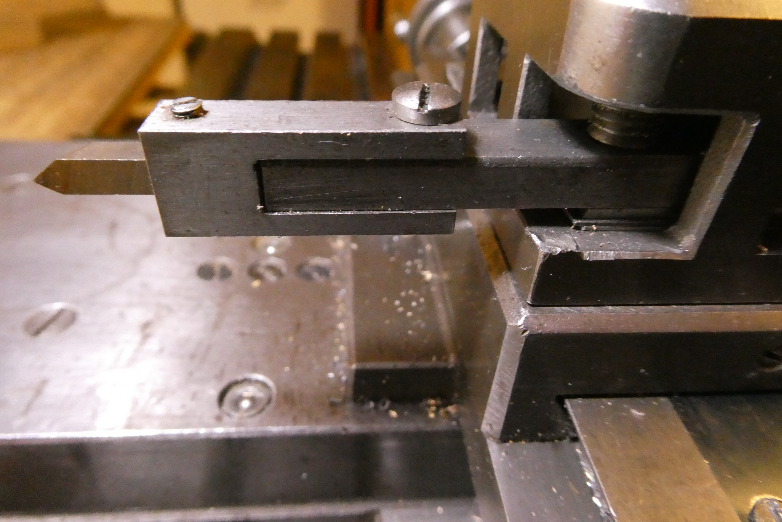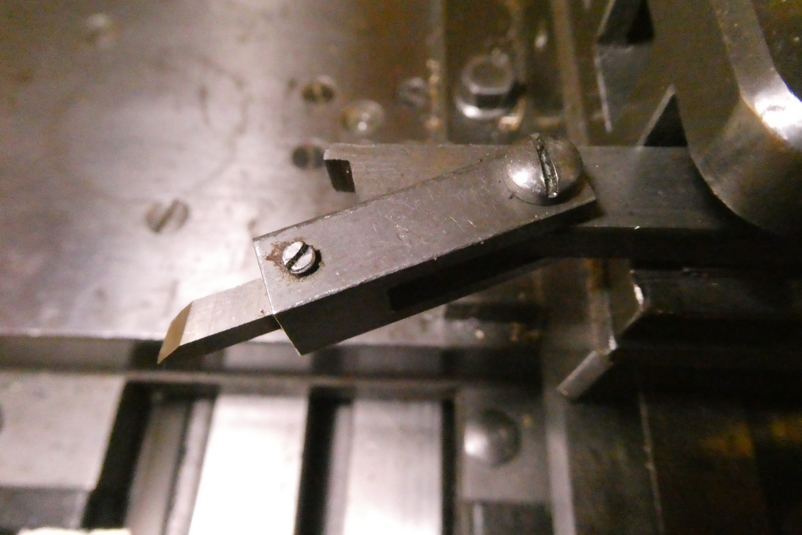 Stupnice ryji rydlem z Radeca. Mám na to odklopný držák, který se při zpětném pohybu odklopí, aby se nepoškodil vrchol nože. Čep otáčení sklopné části držáku musí být pár milimetrů pod nebo za vrcholem nože, aby se nůž od rytého kusu hned oddaloval. Nůž by mohl být i kruhového průřezu, já jsem se piloval se čtyřhranným otvorem.
