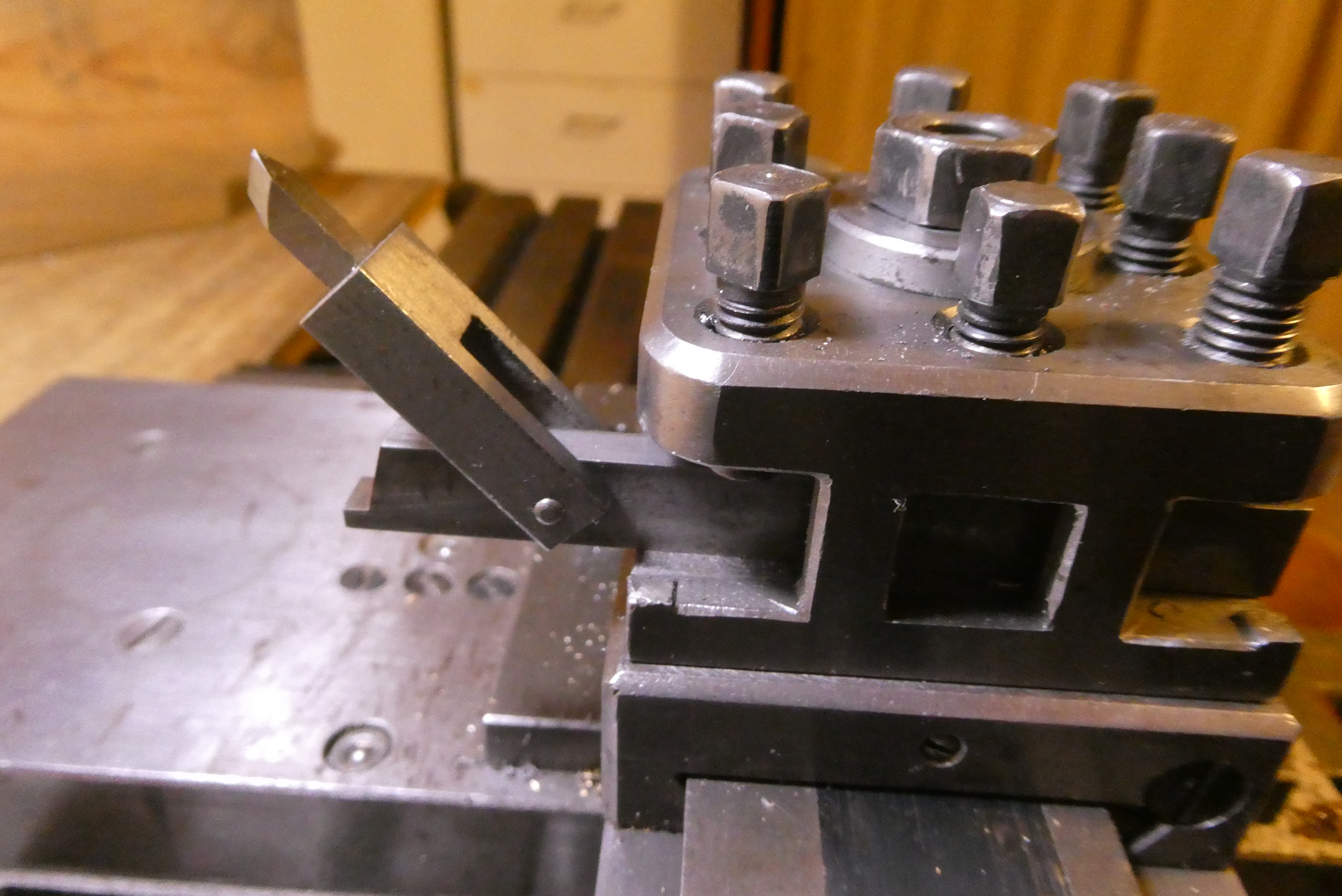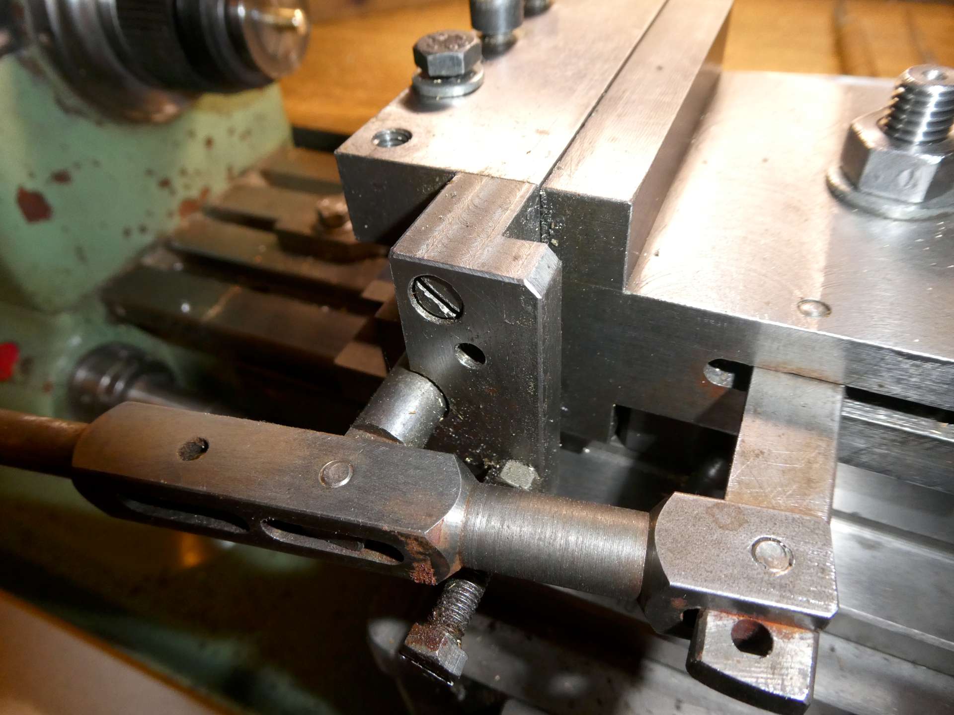 Tuhle příčnou pákovou nožovou hlavu používám již dlouho a osvědčuje se. Pro podélný posuv používám pojezd celým suportem.Obrázek