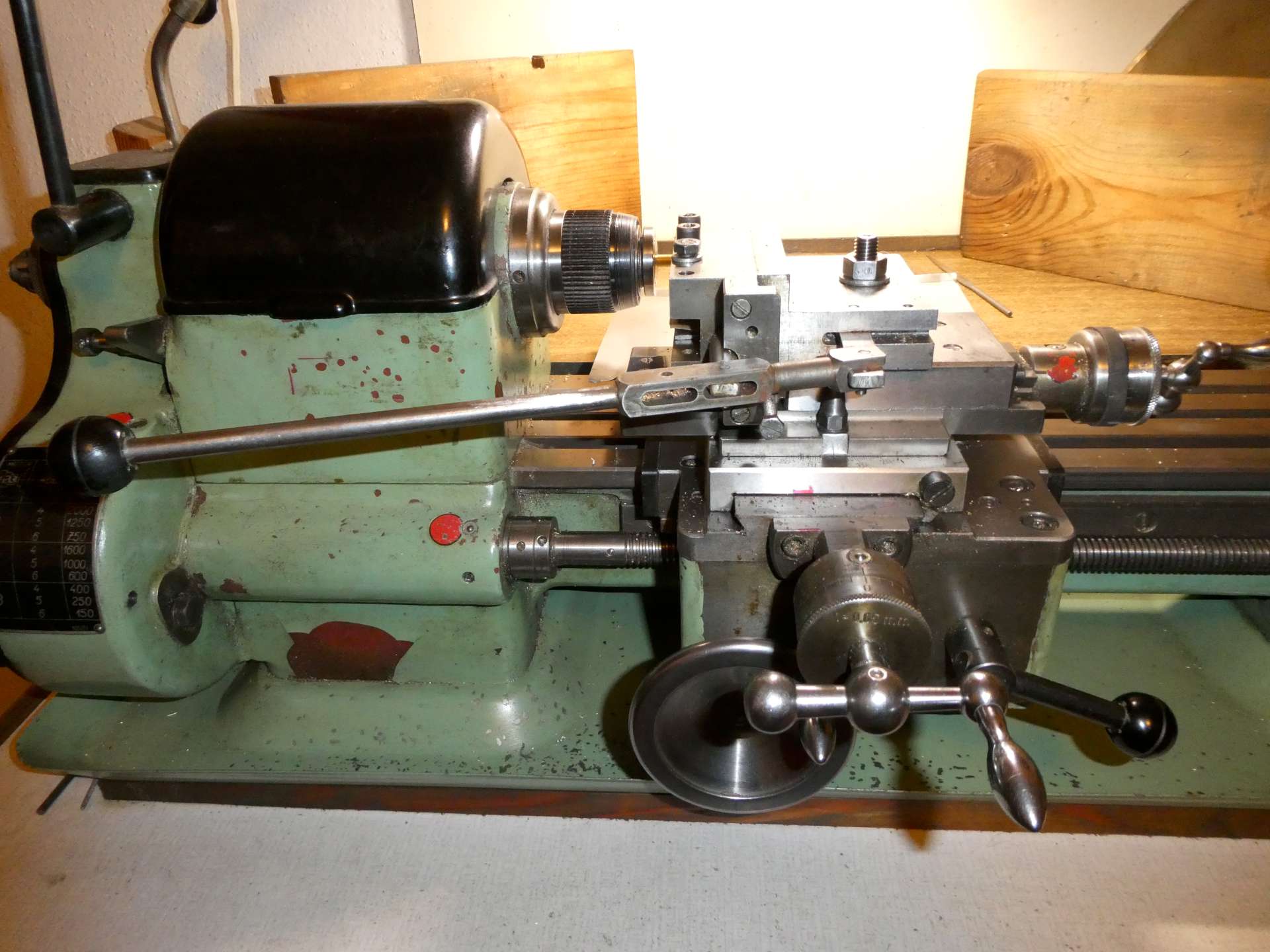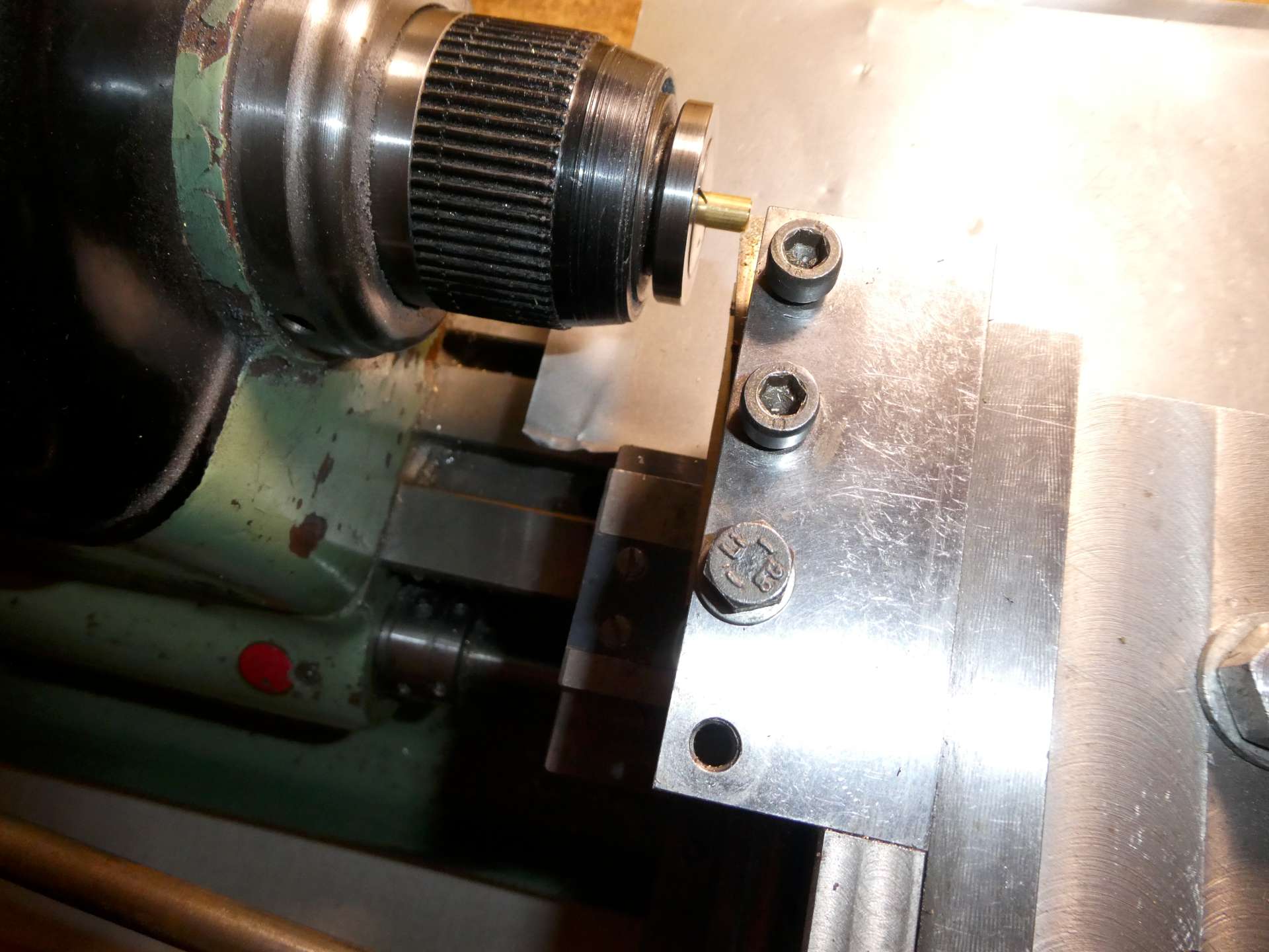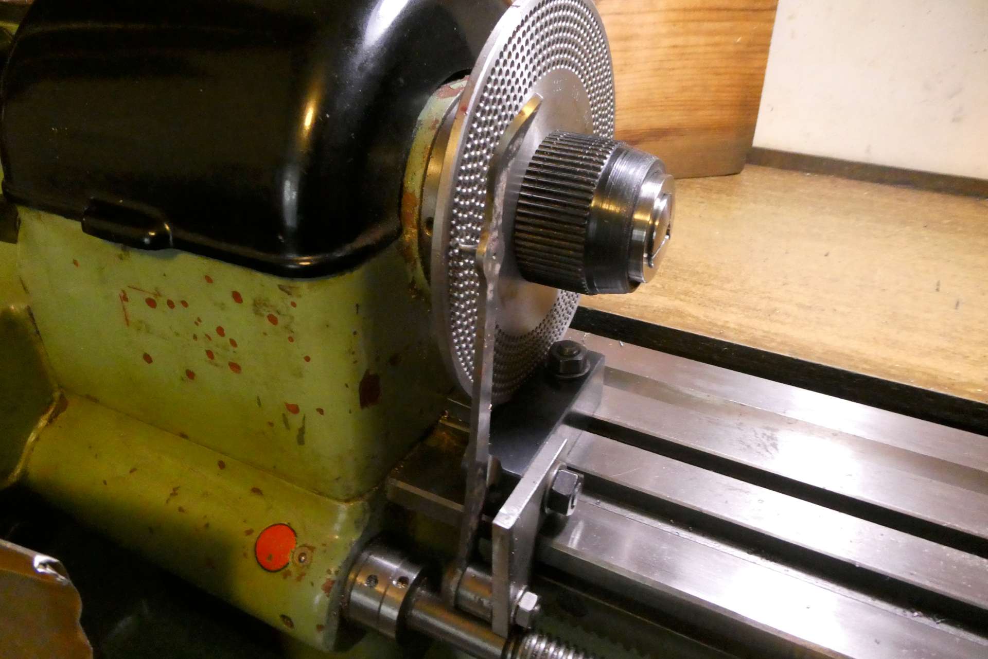 Pro snadnější pootáčení vřetenem při rytí na pinolu jsem si do sousedních otvorů na dělicím kotouči jako orientační pomůcky zašrouboval šroubky s maticí podle potřebné délky rysek.[/img][/img]