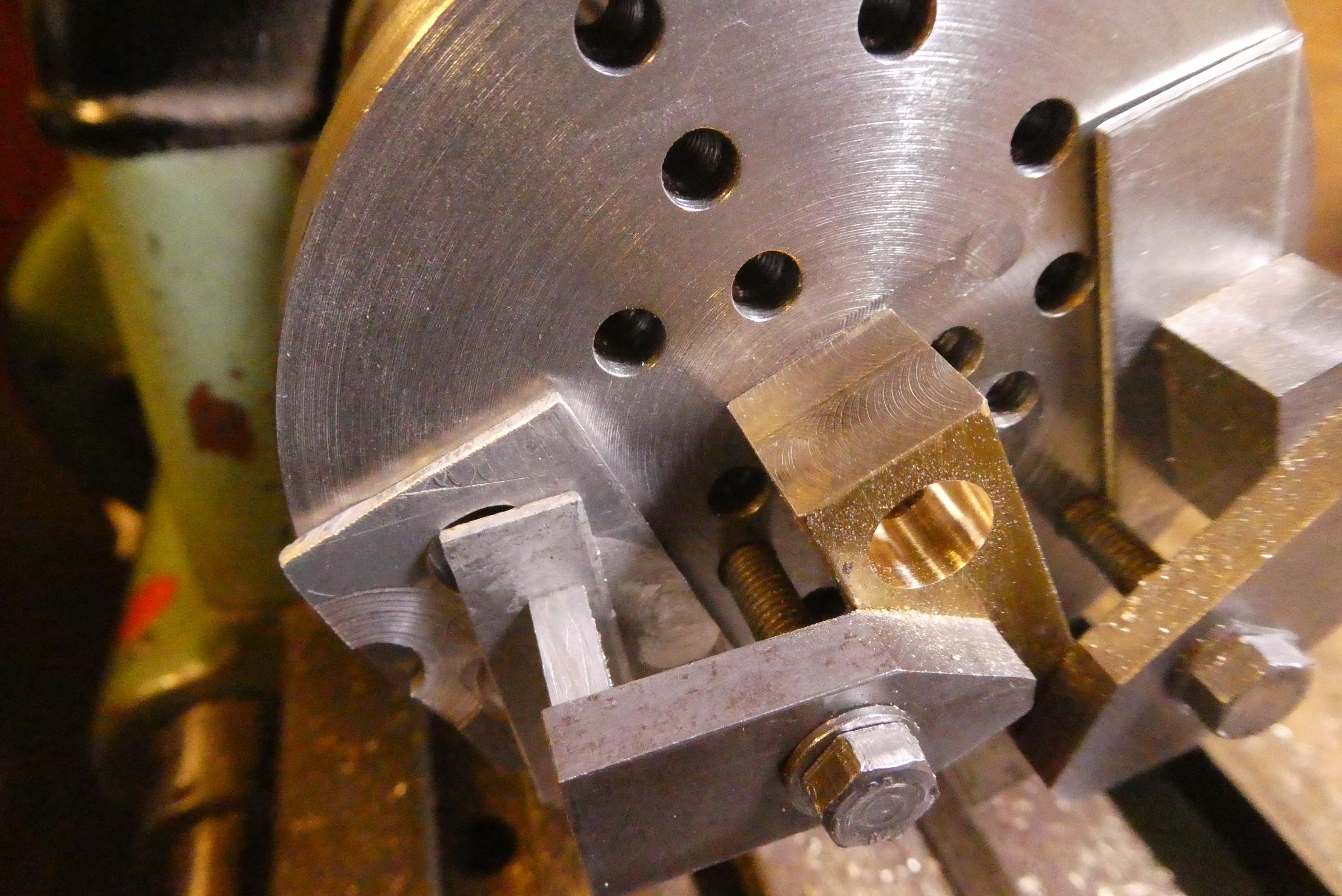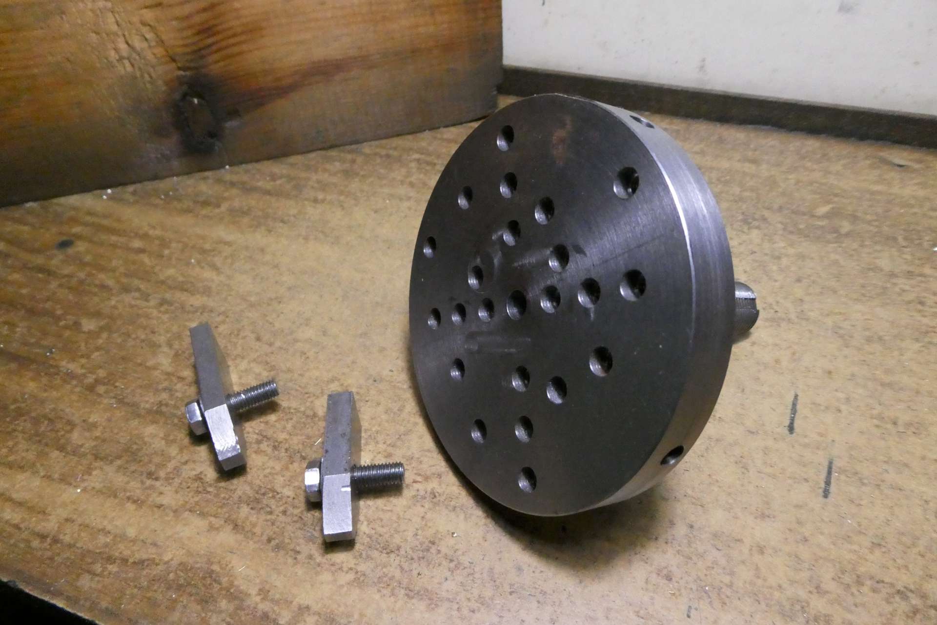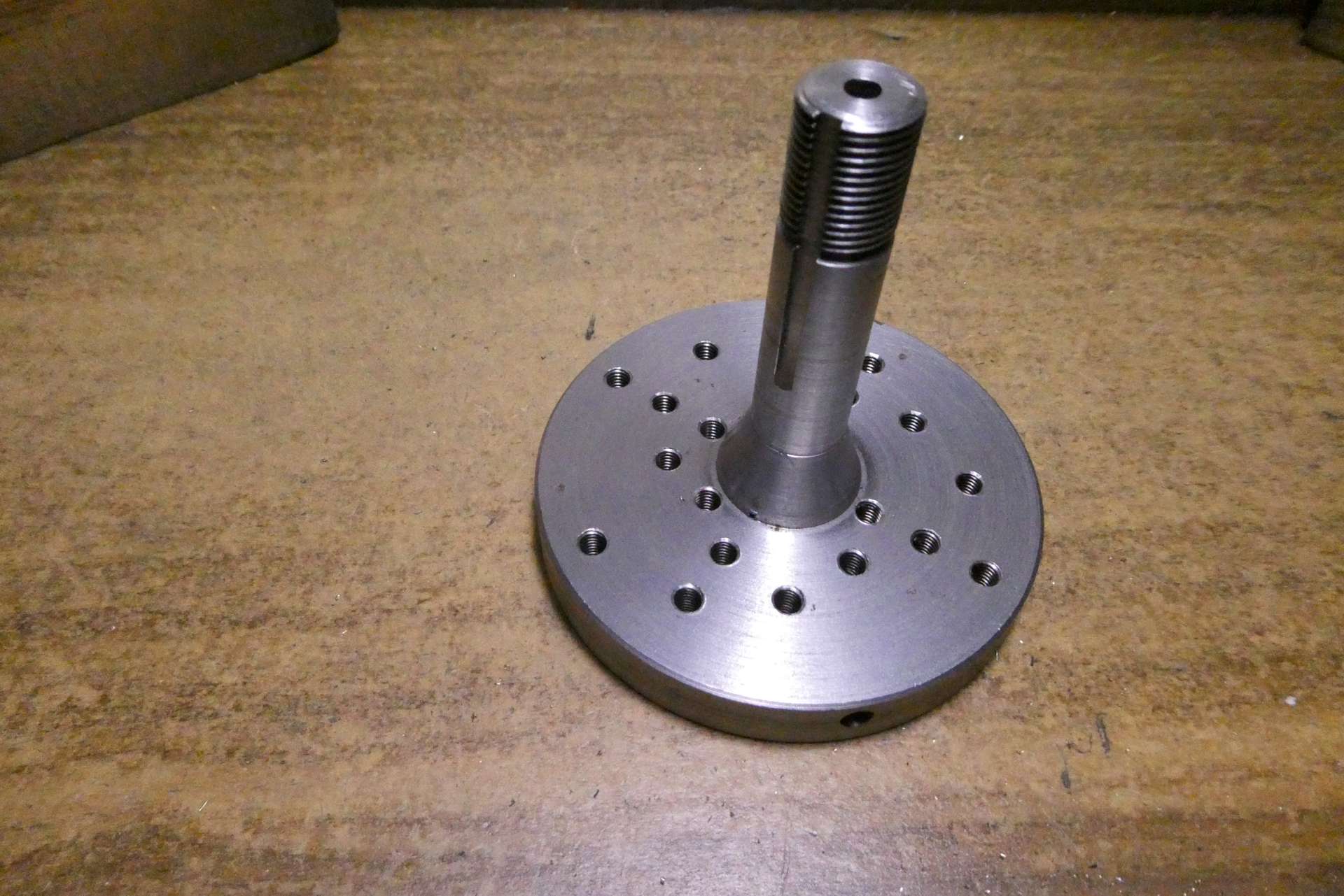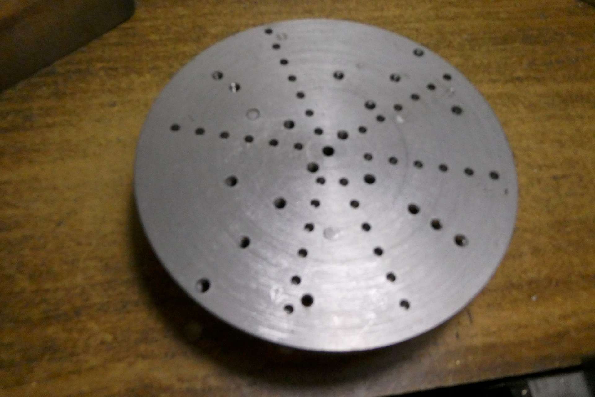 Pro uživatele posílám obrázky mé často používané pomůcky, sloužící k obrábění nepravidelných obrobků. Je to upínací lícní deska s kleštinovým trnem. Používám ji jak do vřetene, tak do děličky. Obrobky se upínají příložkami, lze je orientovat co do vzdálenosti od středu i pomocí trnů do děr. Díry mají v přední části průměr 6 mm a v zadní části závit M5. Vrtány jsou na přesných roztečných kružnicích, v různém počtu. Po obvodu jsou navrtány 4 díry k zasunutí manipulačního kolíku pro ruční natáčení v děličce.
