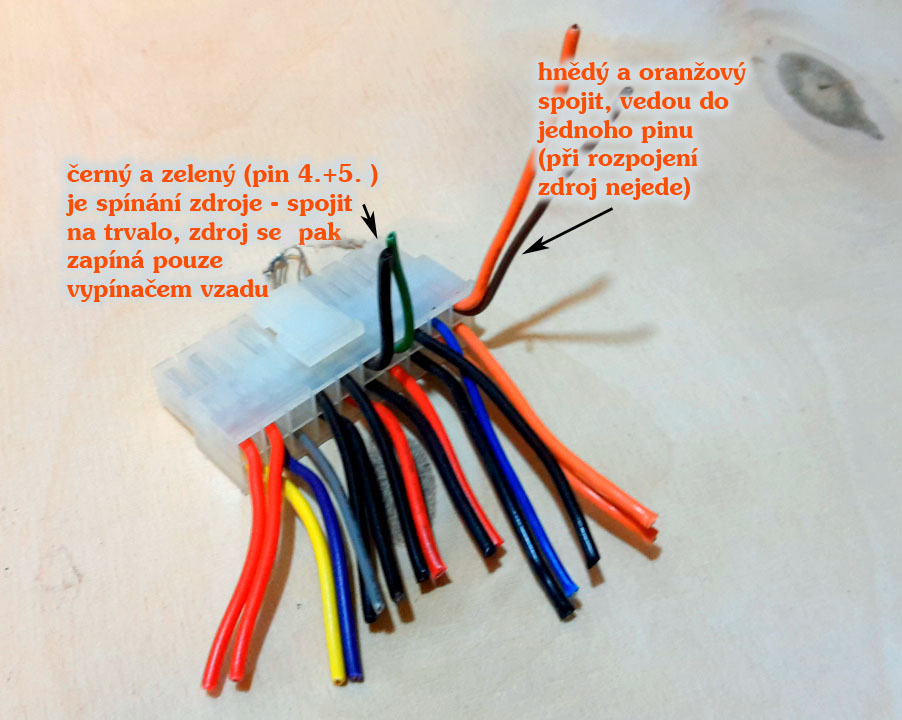 , ale pokud po odštípání nepotřebných kabelů spojíš zakrácený oranžový a černý (barevná kombinace se může lišit, ale jsou to jediné dva dráty do jednoho "chlívku") - zdroj po spojení 4. + 5. p. jede! ... ještě co se týká mýtu kolem toho, že se zdroj musí zatížit a pod., není pravda, novější zdroje není potřeba zatěžovat, zkoušel jsem zapínat bez zátěže a stále vše OK (podotýkám ATX, ale AT zdroj už snad nikdo nemá v chalupě