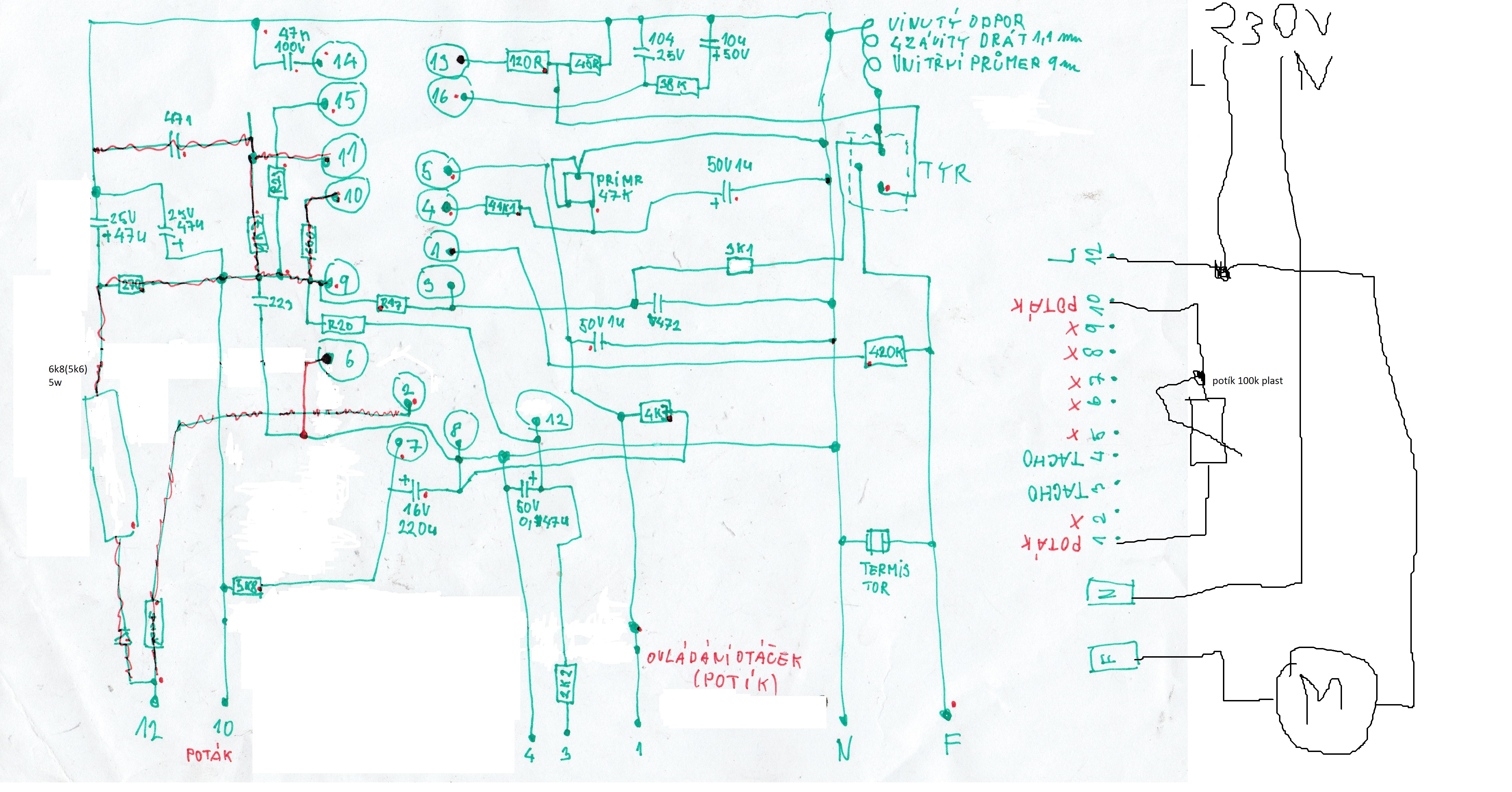 Dnes jsem se dostal knaskenování popíru se zapojenim regulátoru. Něco jsem musel umazat. Nelekejte se červeně začáranejch spojů něco jsem hledal a potřeboval jsem zváraznit. Proto jiná barva neznamená to že to nejni nebo tak něco.. Asi 2 odpory nemají hodnotu protože se nedali změřit protože v okolí jsou kondíky. Ale kdyby někdo potřeboval tak vypájim a změřim. Jinak dneska jsem dělal testy s motorem a je to ideální motor pro kutilské učely... Rozmezí otáček od cca 200 otáček až po max (na motoru píšou 15 tis) Ale při minimálních otáčkách k nezastavení. V porovnání s měničem a motorem v obdobném výkonu.. Měnič je hezkej ale zdaleka nemá takovej rozsah otáček... a hlavně nemá ten výkon v minimálních otáčkách....