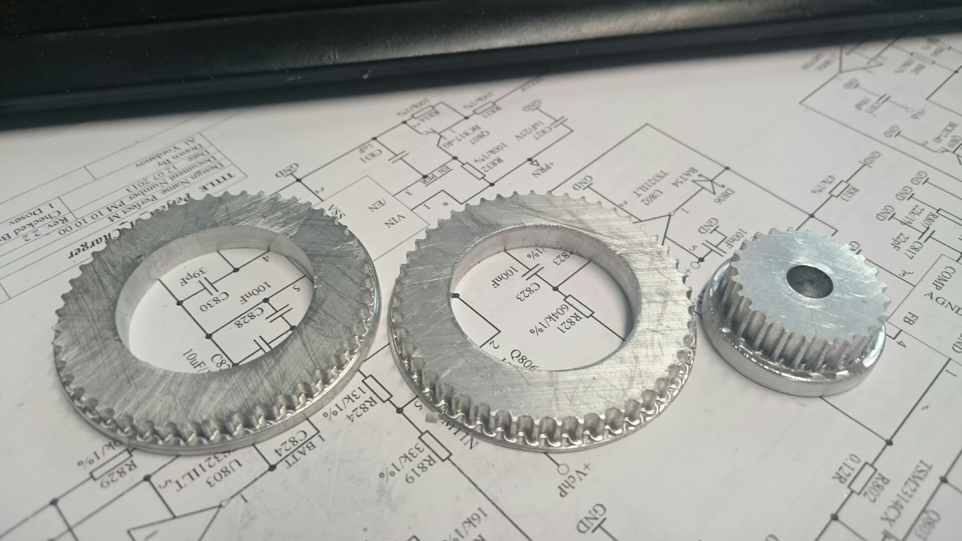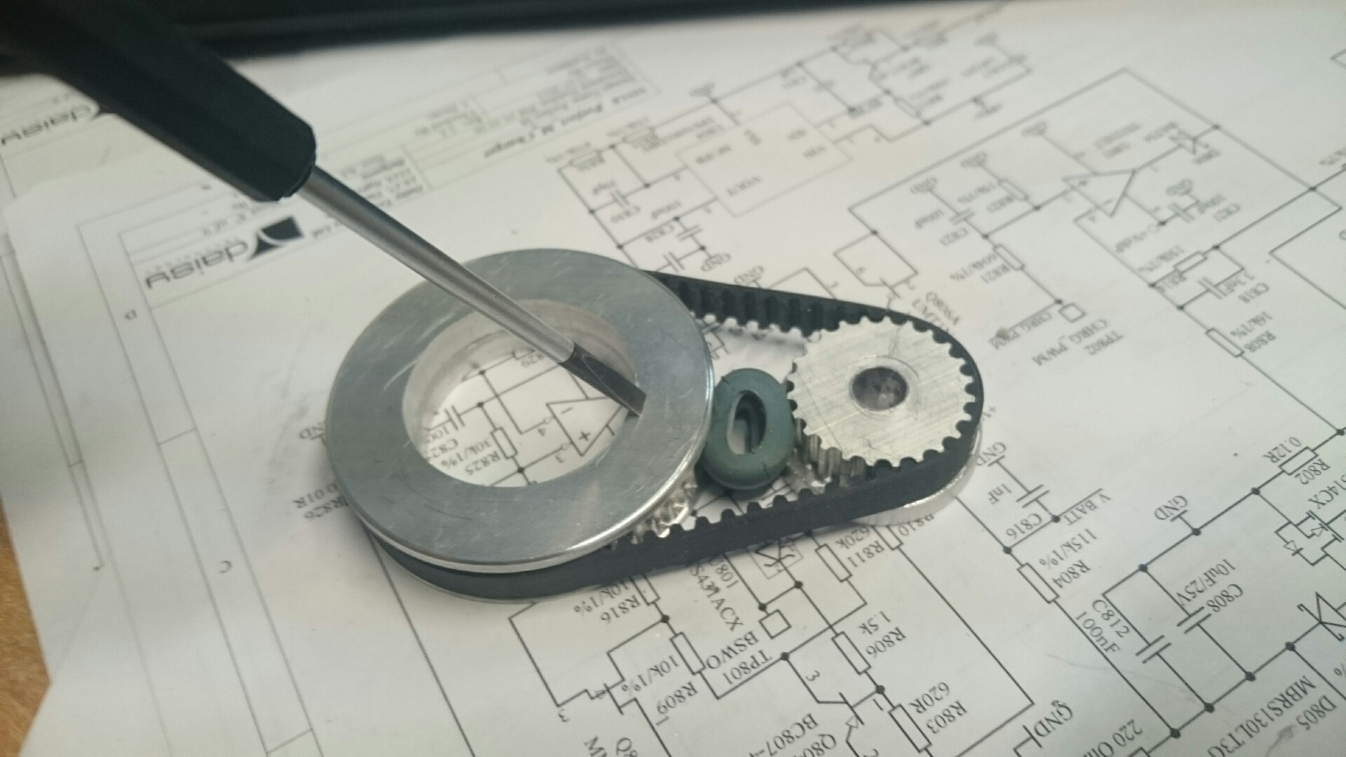 HTD 3M prevod na snimac polohy vretena SM300. Zlomil som 1mm frezku, takze ta vacsia remenica je delena.