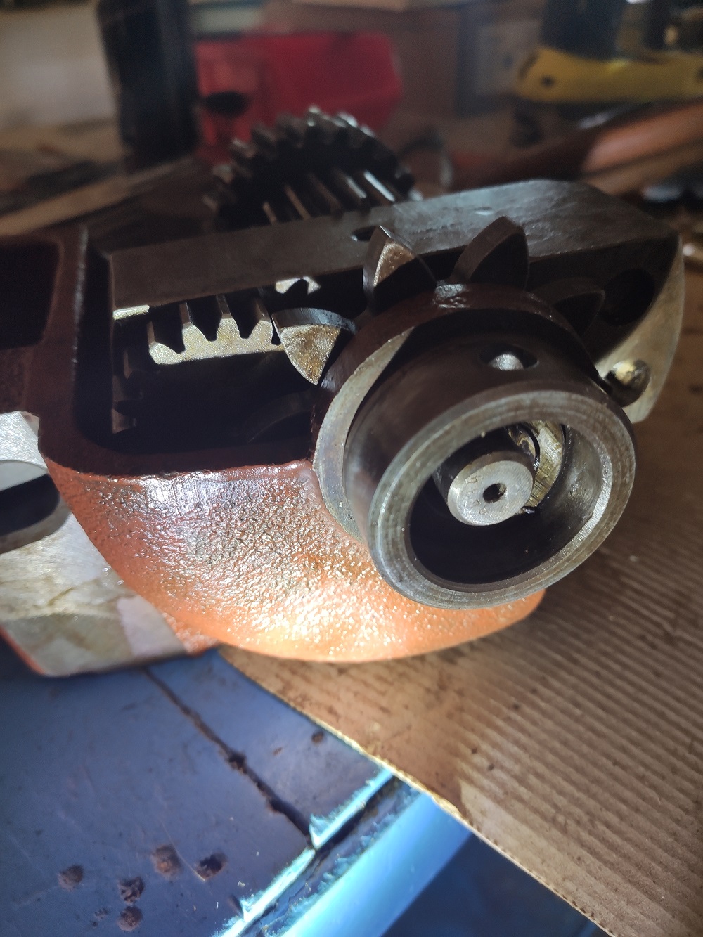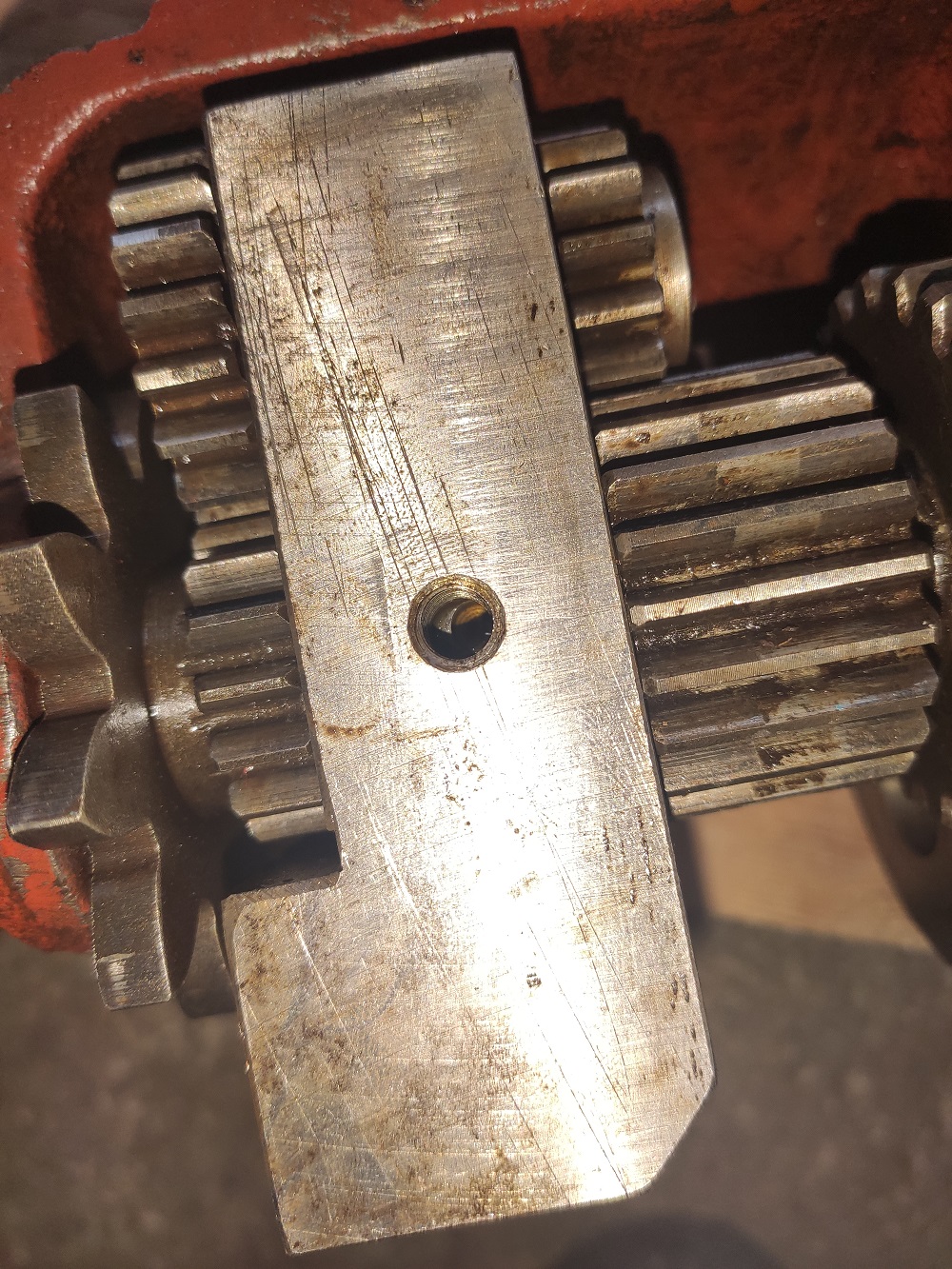 Tenhle díl jde posunout na hřídeli směrem doleva (lze poznat podle toho, že se díra po červíku posune vůči důlku, co je vevnitř). Na druhou stranu se nehne ani o milimetr (tzn. závit červíku a důlek vevnitř jsou zarovnané).