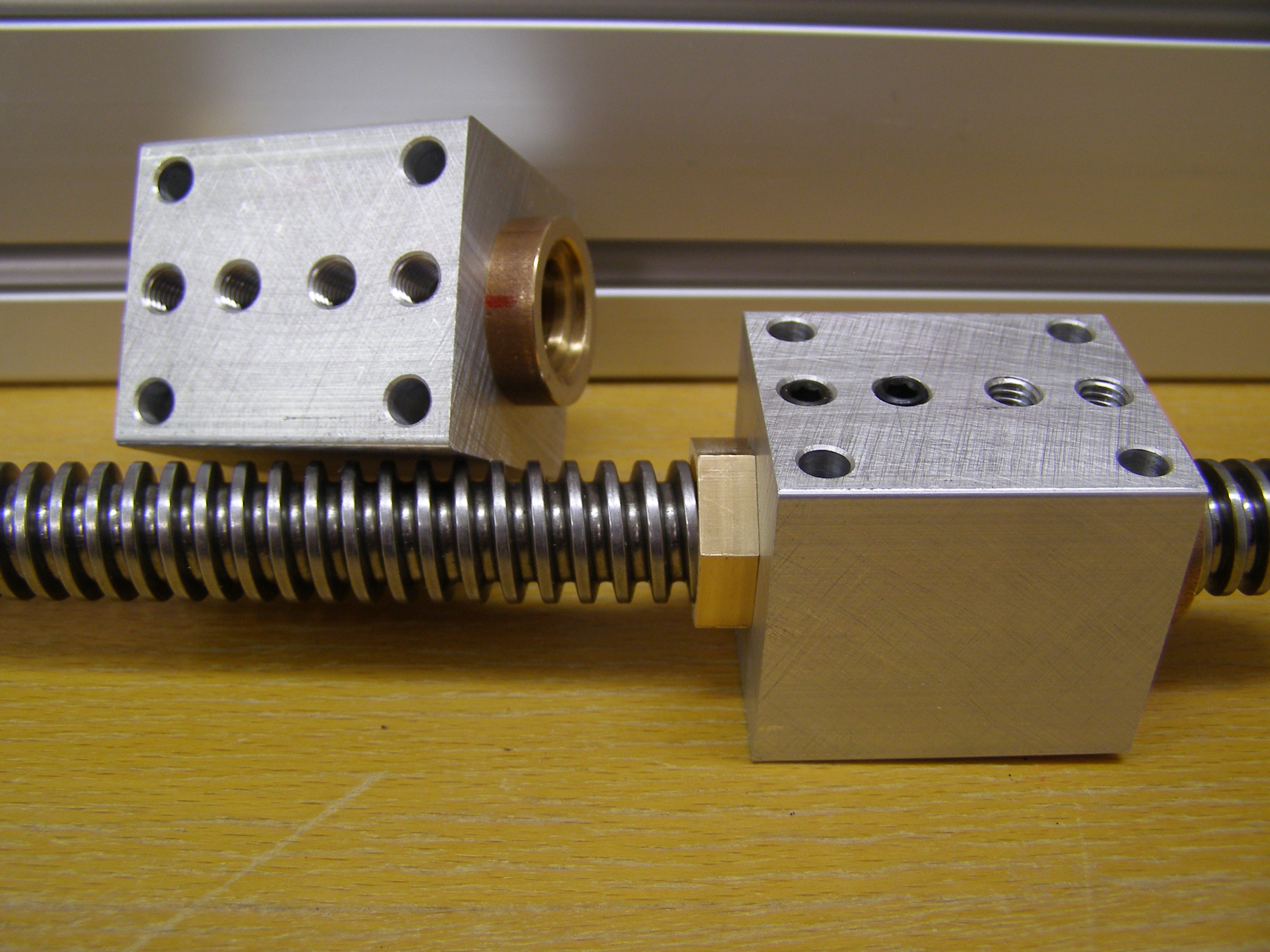 Já už jsem použil jednou tuto kombinaci a bez problémů. Tohle mám nachystané na novou frézku. Princip je v tom, že jedna matice je zalisovaná v domečku napevno(přesah 0.04mm) a druhá co má vyfrézovaný šestihran má na průměru lisovaným do domečku přesah pouze 0.01mm a sní je možnost po zalisování klíčem pootáčet a tím nastavovat vůle jaké potřebujeme no a červík je na případné zajištění matice do domečku. Jo a trapéz je TR 16x4. Bob.