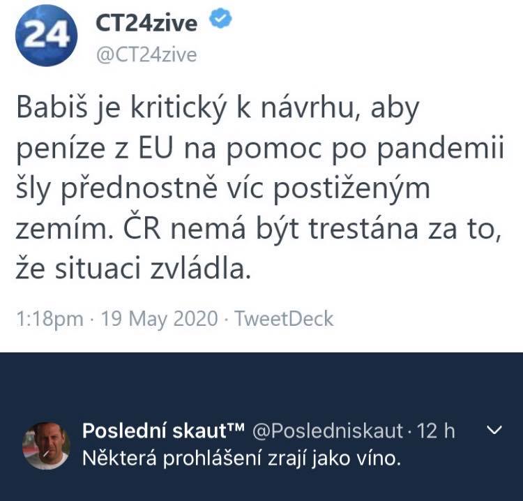 Ale bude potřeba hlasů - 2021 jsou volby do Poslanecké sněmovny. Akorát teď nevím, jestli je to v 1. nebo 2. pololetí. Pak je otázka, jestli je to dobře nebo špatně - každopádně je to důvod aby se Babiš bál (zase na druhou stranu tydýti, co ho volí, ho asi budou volit stejně, protože mají 0 informovanost, a pak vidina Pirátských fetek u moci mě taky rozhodně neláká). Nicméně v rámci toho se pak nastavují epidemiologická opatření nikoliv podle zkušeností jiných a doporučení odborníků, ale podle toho co lidi chtěj (protože tím je na**re méně, nebo je na**re až později až to bude o to větší prů**r) a výsledek je to co je teď. Babiš dle mého doufal, že to nějak do voleb vydrží a současný prů**r bude až v říjnu nebo listopadu, tj. po současných volbách. Jenomže mu to dle mého zkazili dovolenkáři dovozem covid, kterým podkuřoval, protože by umřeli, kdyby jeden rok nejeli k moři.Josef píše: ↑28. 9. 2020, 1:07 2Mart_68: Tak uvidíš, jaké "politikum" se z toho stane po volbách. To už zase nebude potřeba hlasů v blízké budoucnosti a začnou se dít věci. Pokud tomu politiku nevěříš, tak se jdi konečně někde nakazit, ať to teda demonstruješ na vlastní kůži a dokážeš svoje tvrzení. Hodně štěstí!