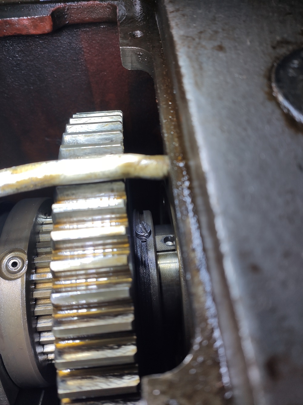 Vřeteno jsem uvolnil do té fáze, že se hýbe o 2 nebo 3 cm. Na žádný červík vzadu jsem nenarazil, povoloval jsem akorát ten, co byl zakrytý (asi zajištěný) drátovou sponou a je vidět na fotce. Na matice u kluzných ložisek jsem nesahal. Při jemném poklepání zezadu se vřeteno akorát odráží zpátky, tzn. na něco natvrdo naráží a mám pocit, že to je někde v oblasti předního kluzného ložiska, ale možná to klame. Ze schématu mi totiž přijde že tam snad žádná překážka být nemůže...