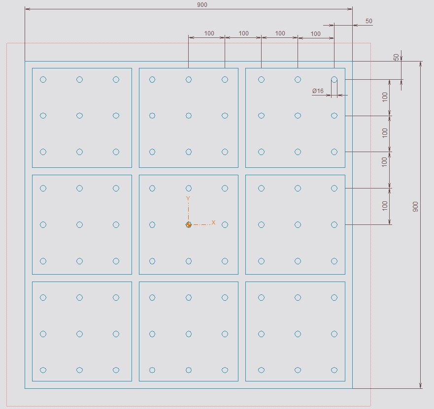 Tak ta litinová deska je 900 x 900 a vrtání děr jsem vymyslel takto abych byl mimo žebra a v rozteči 100 x 100, průměr 16H7.