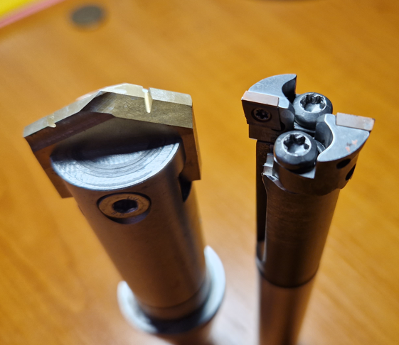 Na hrubovanie otvorov používam tuto velkú MAS hlavu. Je dosť tuhá, a ak sa nepoužijú nožíky zbytočne dlhé, ide to velmy rýchlo, a hlavne bez vybrácií. Výhoda sú aj tie nádstavce, že sa nemusia vložkovať nožíky, a vďaka sánkam sa dá rýchlo pestaviť. Nožíky s VBD sú velká výhoda, treba sa vyvarovať velkých rádiusov, na dokončovanie niečo ako je na fote.