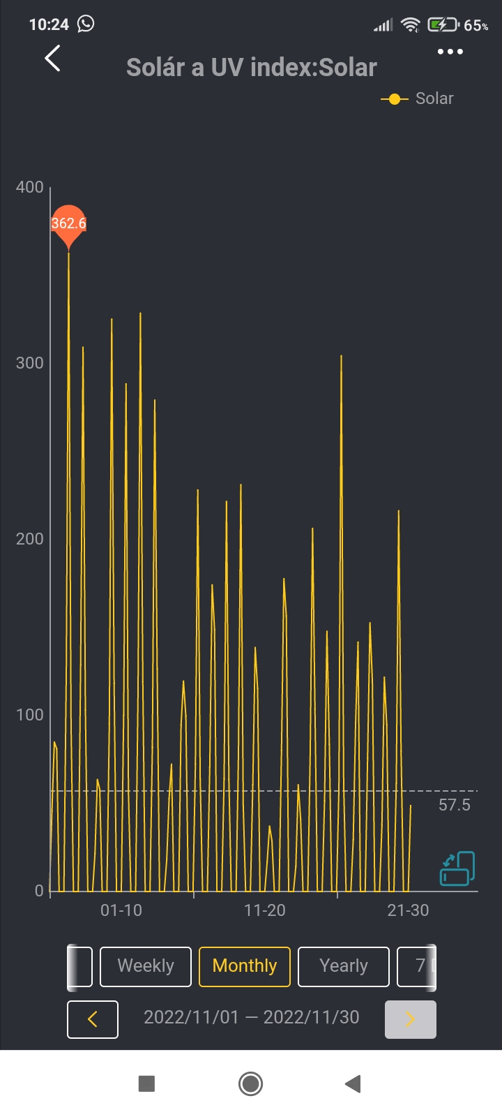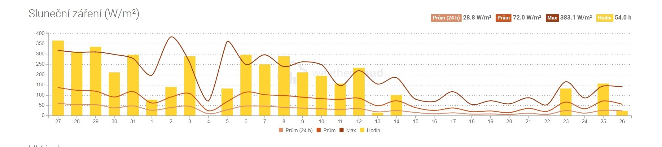 šlo mně primárně o to si to zprůměrovat. stanice měří aktuální hodnotu ve W/m2, každopádně po zaregistrování na tom ecowitt už se tam dají zobrazvat i grafy., denní, měsíční, roční atp. umí toho hodně......jak je to přesné jsem nezkoumal, takže berte to jako cca