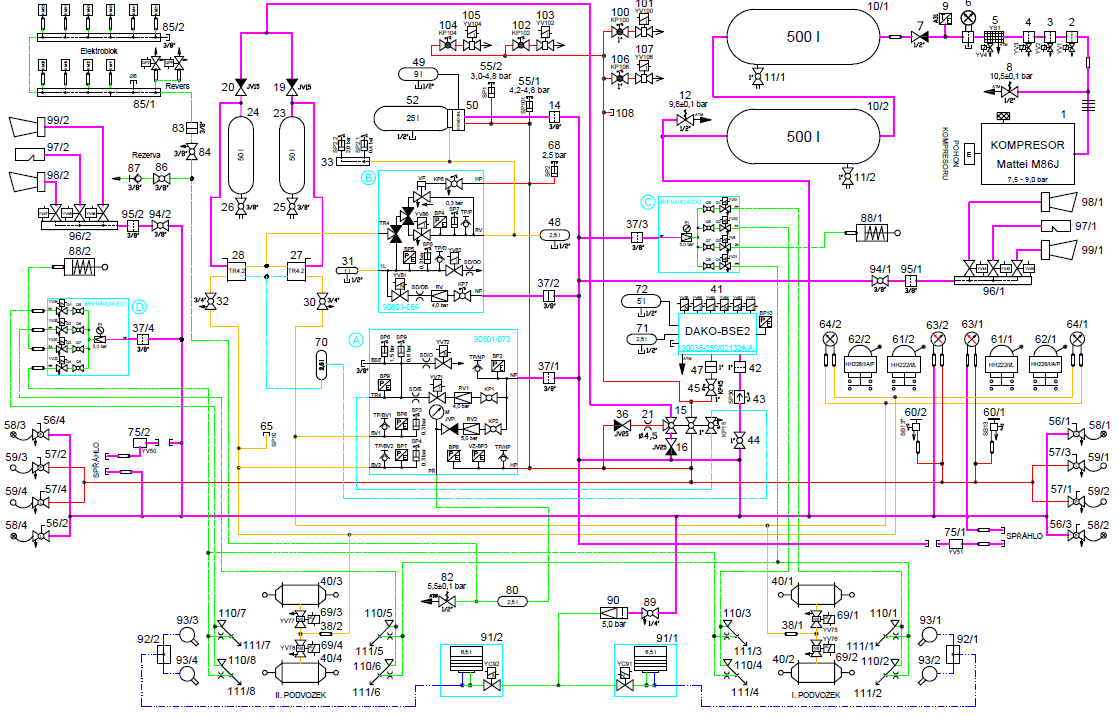 Tyrkysově znázorněné panely (A, B) jsou mezi rozváděč a tlakové relé vloženy proto, aby se dala řešit vzájemná součinnost více typů brzd (samočinná, přímočinná, doplňková, střadačová). Zbytek schématu je spíš bižuterie (ovládání stykačů, houkačky, pískování, mazání okolků).