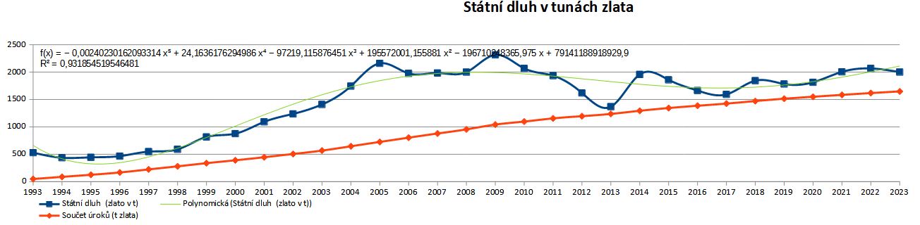 Další graf k zamyšlení. V podstatě dobrá zpráva. Moc nám ten náš státní dluh neroste. Jenom ty kumulované úroky, to je síla. V podstatě jsme prožrali tak 25 Temelínů. Mají to soudruzi dobře spočítané. Každému obyvateli včetně nemluvňat a důchodců měsíčně vytáhnou 0,44g zlata z kapsy nad úroveň běžného zdanění a my nedržkujeme.