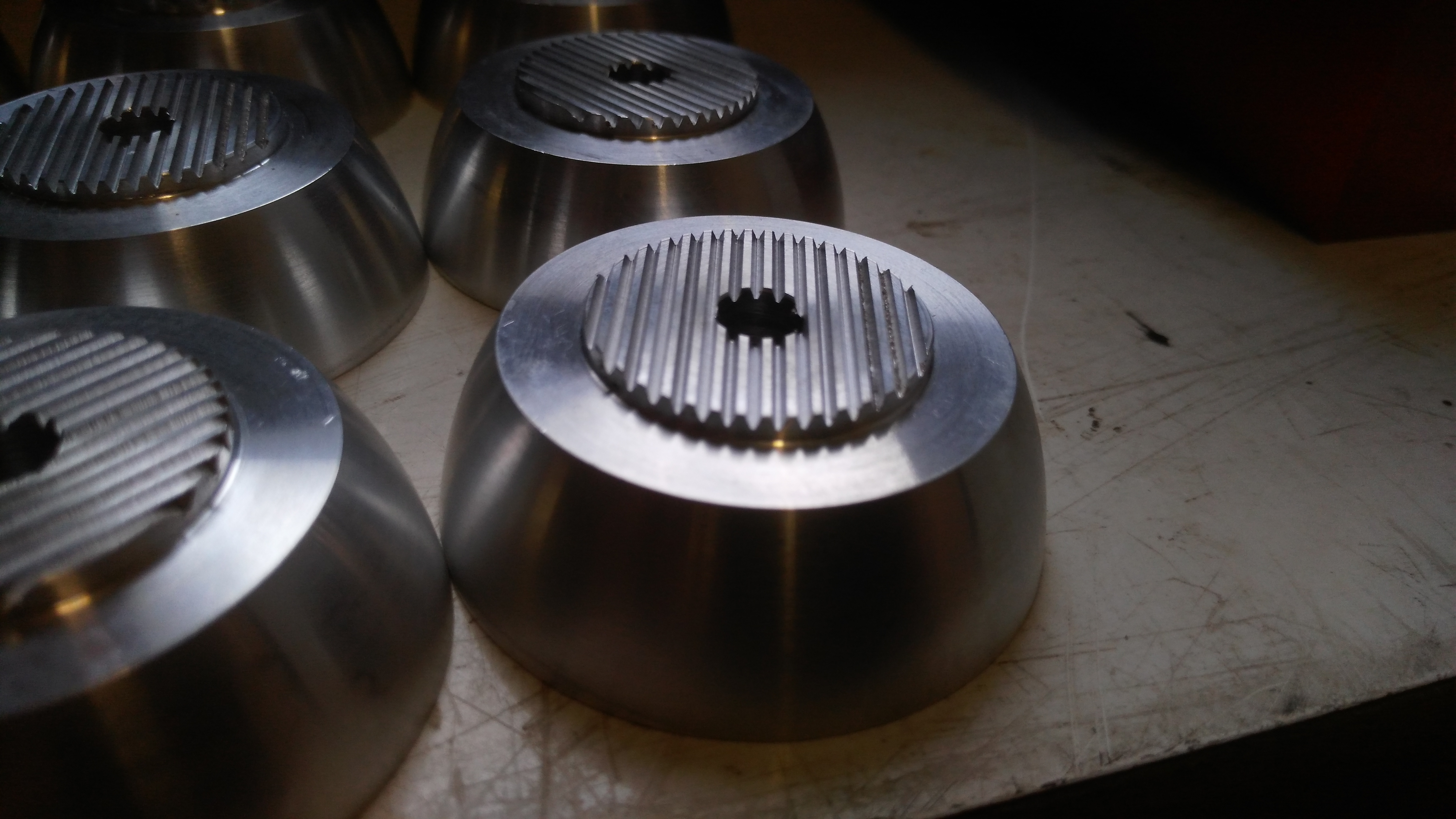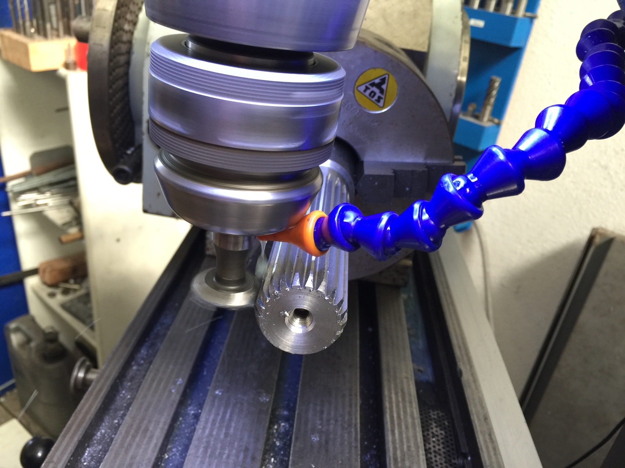Tak jsem dnes začal dělat pro kamaráda chladící vrtulky na modelářský spalovací motor. Fáze jedna udělat drážkování aby neprokloklouzla vyrtule. Udělal jsem to obyč čínskou V frézou ( asi 60 kč/ks) a jel jsem asi po desetině. Nechtělo se mi u toho stát tak jsem chladil tak jak jsem šel okolo a tak když se to moc nechladilo udělalo to u dna drážky trochu otřep ale jinak asi v pohodě. Dnes musím vycamovat lopatky a zítra to snad dám do 4 té osy. Nějak se mi do toho nechce je to zadarmo a opruz. Snad to v té 4 té ose nějak půjde na mém gumovém stroječku.