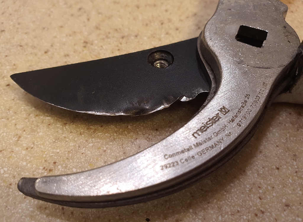 Zahradnické nůžky značky Meister po prvním použití (šroub čepele a čep už jsou vymontované). Nezkracovali jsme tím tyče pro rajčata, ale túje. Tvrdost čepele 22 HRC, říkám si, jestli to není málo
