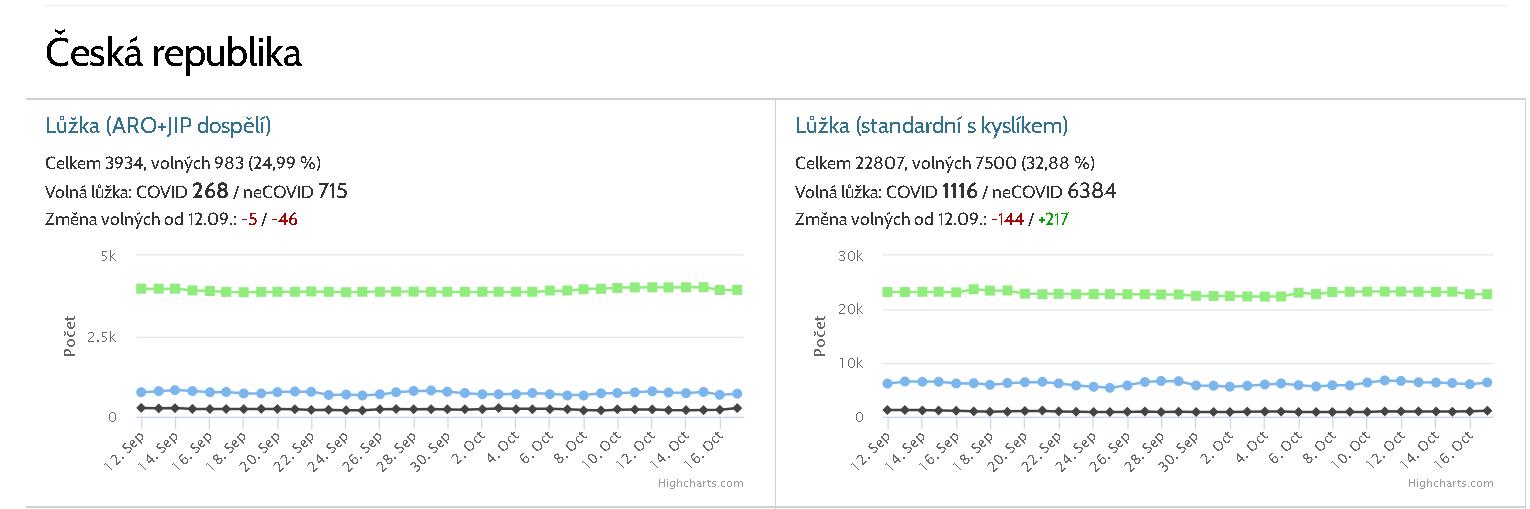 na stránkách https://www.hlidacstatu.cz/kapacitanemocnic#CR jsou data a i grafy volných kapacit nemocnic s rozlišením až na konkrétní nemocnici + data ke stažení. Grafy zobrazují vývoj volných lůžek za období ... a v obrázku i spočítaná změna od: 12.9. do 17.10