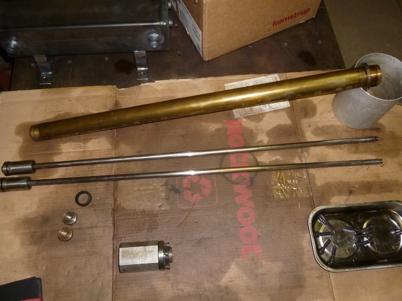 Zajímavé je, že válec pístnice je mosazný a jedna strana je v kostce našroubována bez jakéhokoliv těsnění (myslím to aspoň napakuju teflonem) a druhá strana je jen nasunutá suvně a těsní ji veliký tlustý O kruh (patrně z důvodu dilatace protože obě koncové kostky drží natvdro na odlitku mašiny).