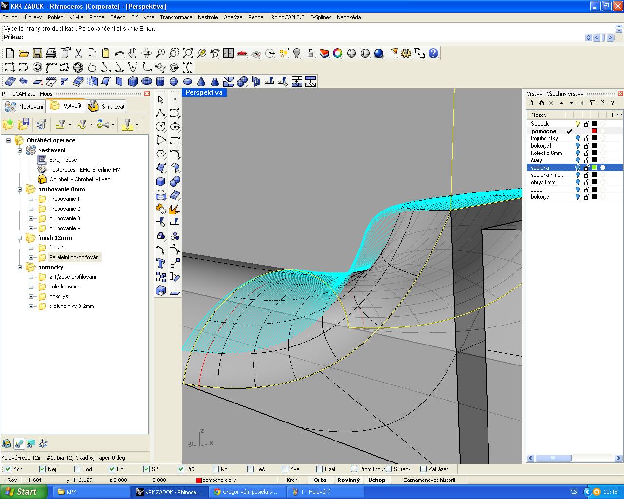 Nazdar chalani ... chcem sa spytat taku vec kresli a programuje niekto v zostave RHINOCEROS A RHINOCAM? Nastal u mna taky problem programujem jeden vyšší krk a finish mi nejako zle počíta dráhy. Zadal som Paralélne dokončovanie, nástroj 12mm gulička, obrábanie podla regionu - označený na obrázku, bočny krok 6% nástroja a tie drahy su nejake divné vobec nie podla obrobku a neviem čo s tým :(