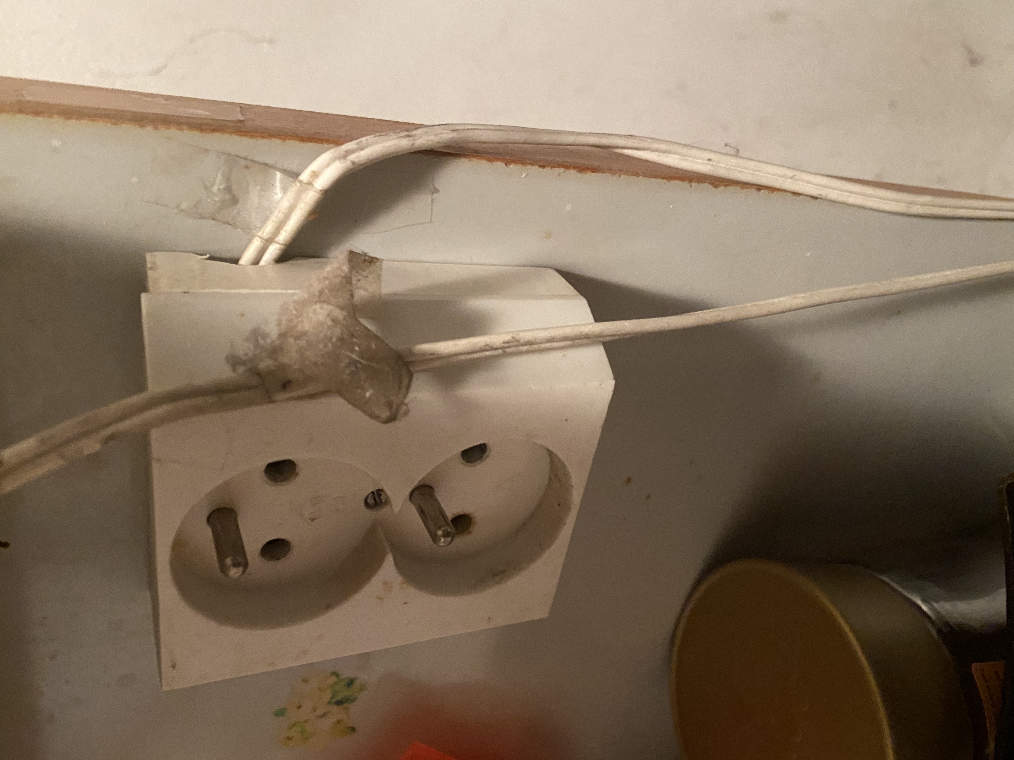 Zásuvky byly propojeny obyčejnou bílou dvojlinkou průřez 0,75mm !! a zemnící ochranný kolik nebyl zapojený - propojený vůbec!! Dvojlinka byla přilepená po kuchyňské lince izolepou . Kdo ti to proboha dělal. A ona mi na to odpověděla to zapojoval táta před 40 lety.
