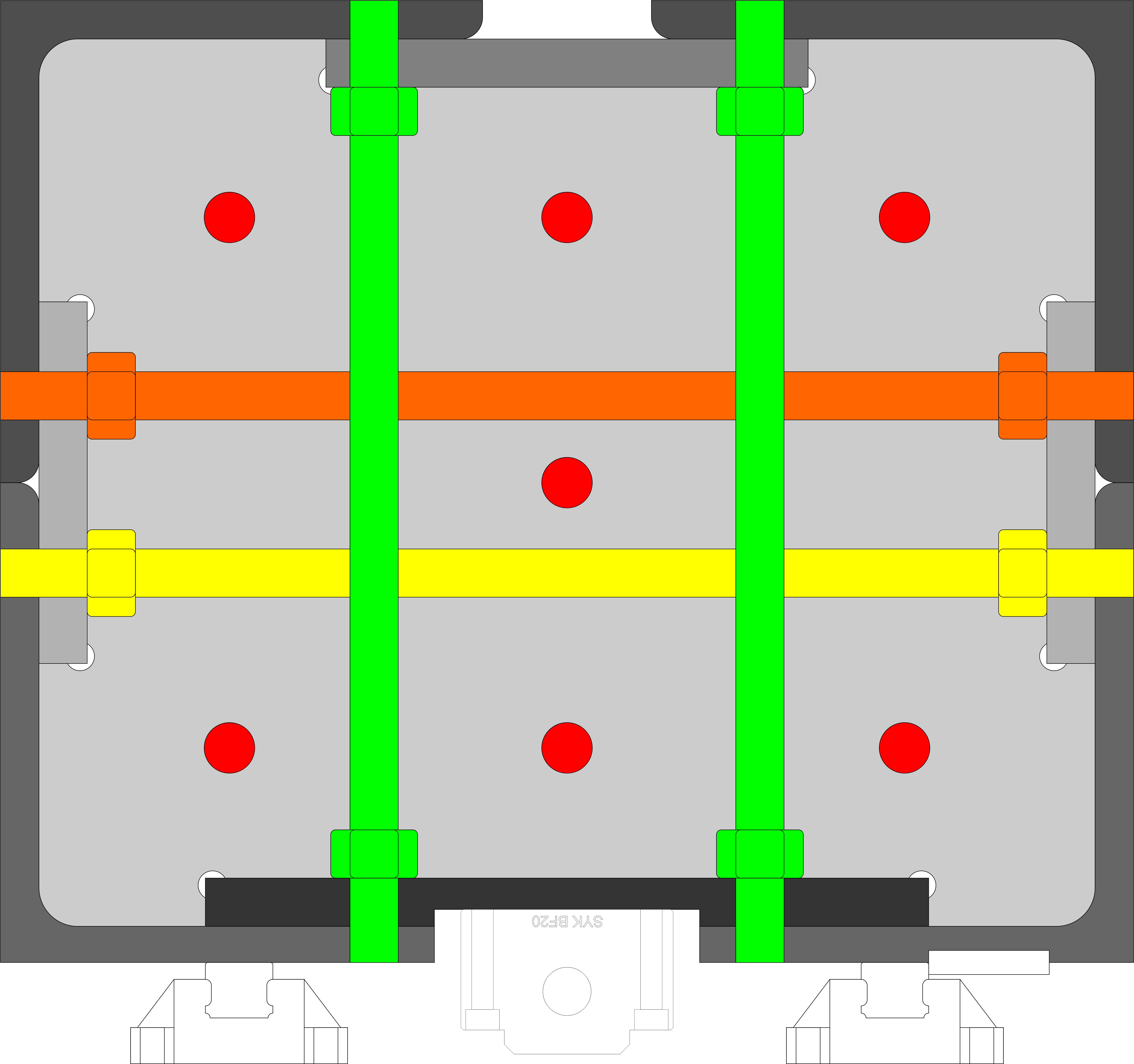 Stejná otázka nastává při konstrukci z polymerbetonu. Jde o tu formu. Viděl jsem jak to borec dělá ze dvou částí a pak to podlije a zalepí. Ale mně zajímá to, jak pevná forma by musela být, aby šlo usadit opracované inserty (připevnit k formě), pak kompletně zalít aby to bylo finální řešení bez nutností opracovávat. Bavíme se o molosériové výrobě, tedy že se třeba 10 lidí domluvíme, že chceme sloupovku těchto rozměrů a oplatí se vyrobit pevný korpus. Jde hlavně o ten blok uvnitř. Stěny můžou být i z desek, ale korpus se nesmí hnout. Tyrkysově je ocelový korpus (přesně opracovaný) referenčními plochami pro připevnění opracovaných insertů (šedě) Ty by se přesně usadili před zalitím a pak by se sestavila forma a zalila. Podle toho co jsem četl, tak to tak rovněž dělají. takže záleží na přesností kopyta. Pokud se opracuje dostatečně přesně a bude natolik tuhé, že žádné reakce od zrání polymerbetonu ho nezdeformují, tak by se nemělo být čeho obávat, nebo se pletu? Bavíme se o kovovém kopytu, žádní MDF desky, sádra...