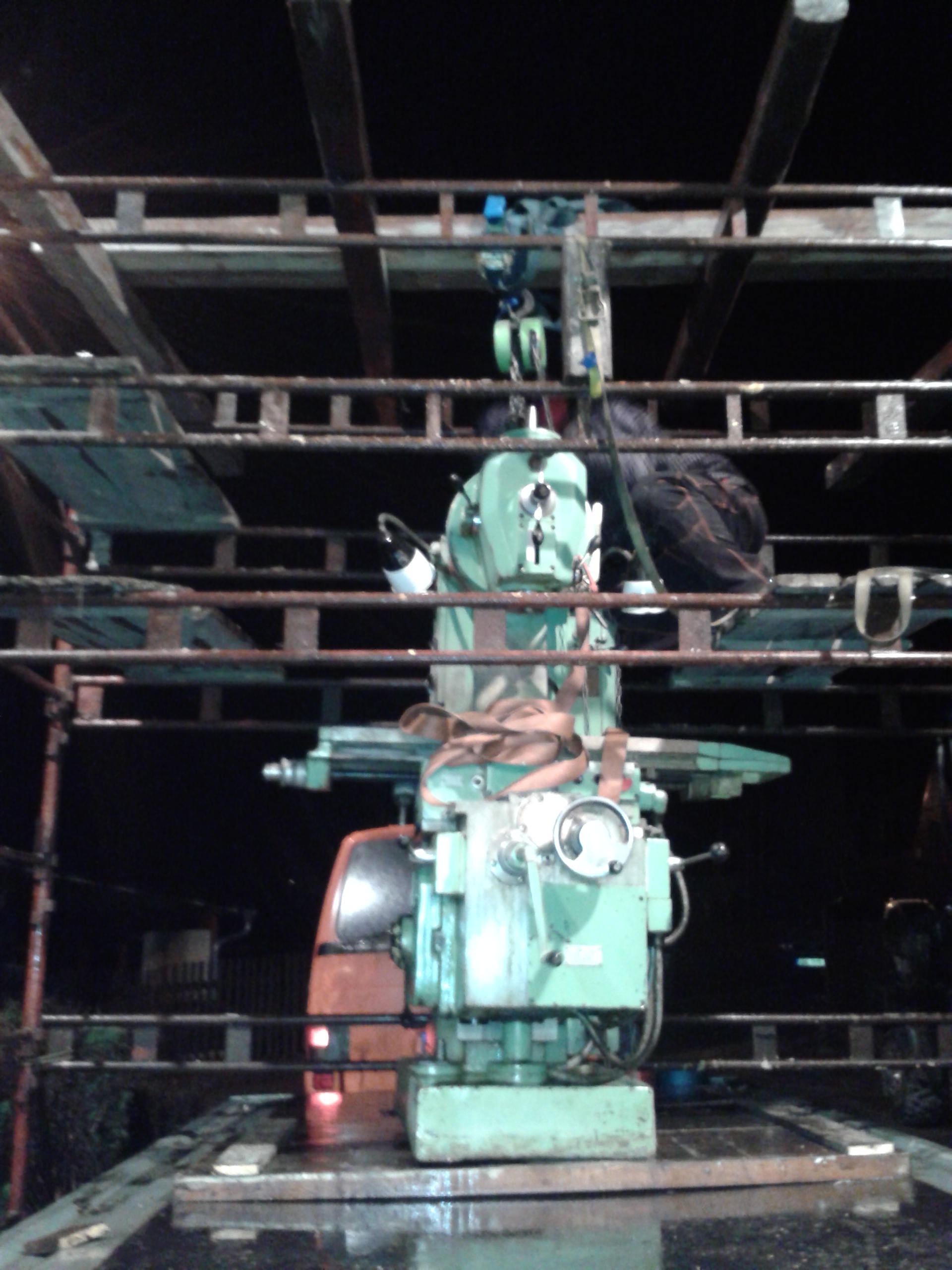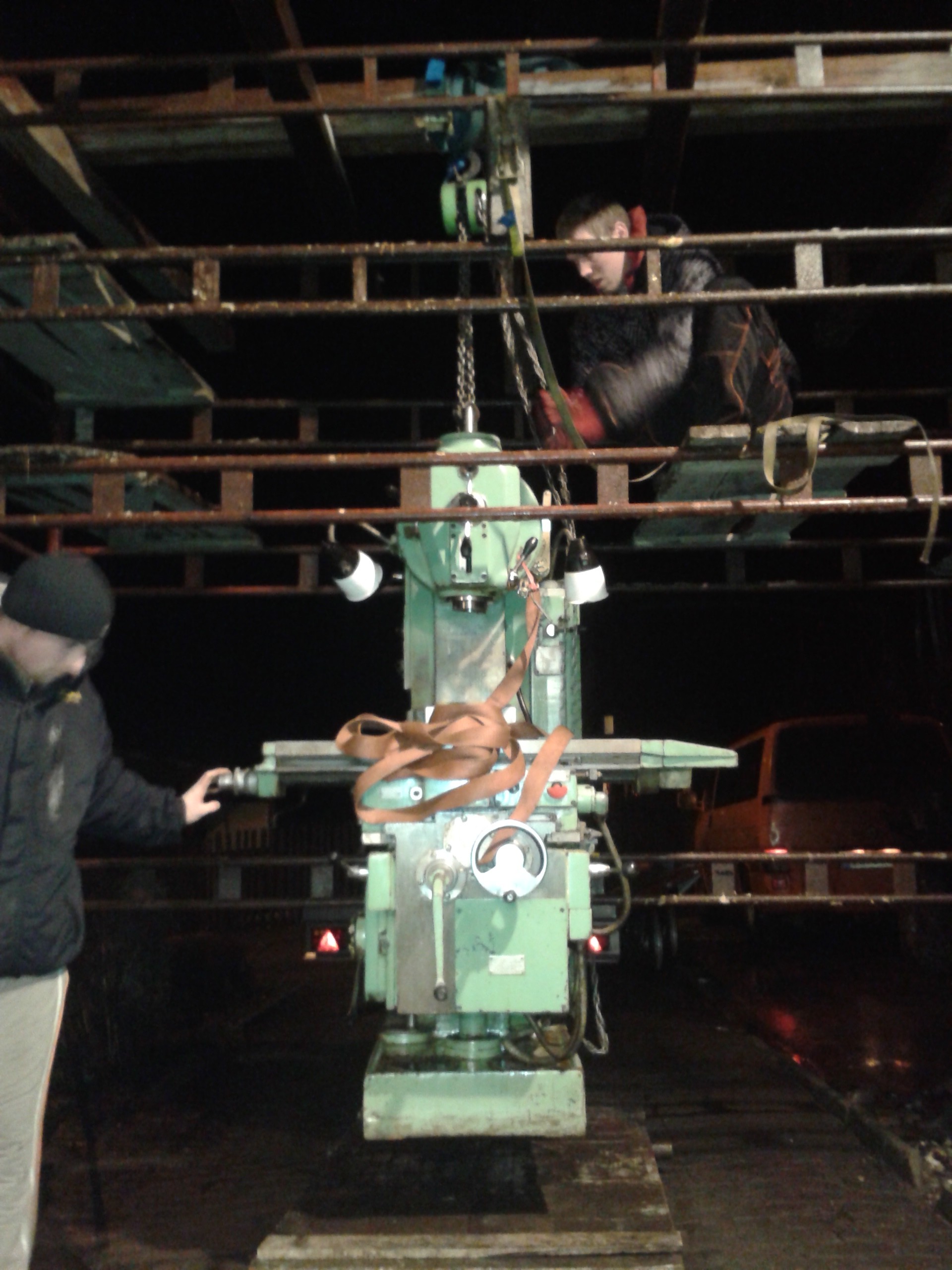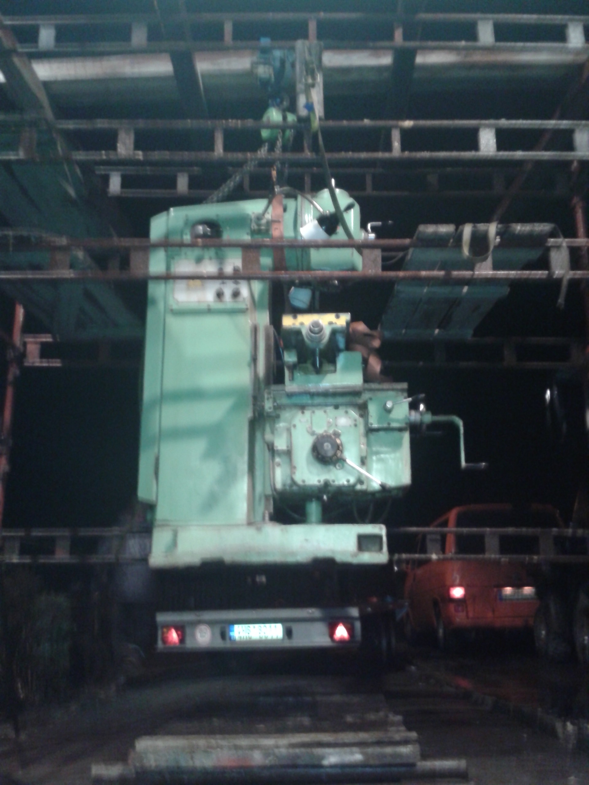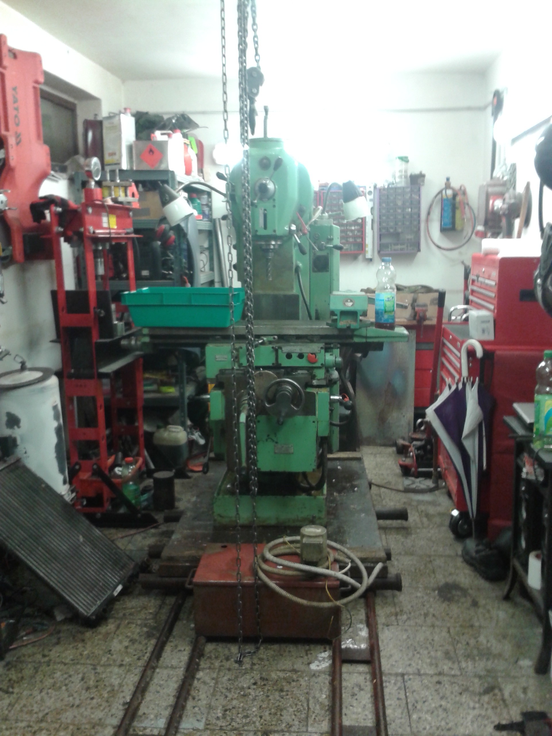 Tak frézka je už doma v garaži . Naloženi proběhlo docela v pohode meli ve skladu 5t. portalový jeřáb. Po přijezdu jsem nacouval pred garáž a kolem vozejku postavil lesení ruzně vystužil a ukotvil nahoře přez nej dal 12x12 tramky jak podel tak napríč a k nim uvazal řetězovou kočku. Když se frezka přizvedla tak se vyjelo vozejkem a pomalu se spustila na 10cm tlustou bukovou desku pod kterou byly trubky ktere jezdili po prickach z leseni jako kolejnice šlo to až překvapive snadně zatlacit až do garaže. Dnes ji připojim k proudu a jeste celou zkontroluji ve skladu jsme ji zkoušeli a zdalo se vše funkční. Ještě bych potřeboval poradit co se kam leje za olej pač ho tam je malo koukal jsem ze to ma i nejake centrálni mazáni či neco takoveho. Nejlepší by byl nejaky manual alespon z podobneho stroje.