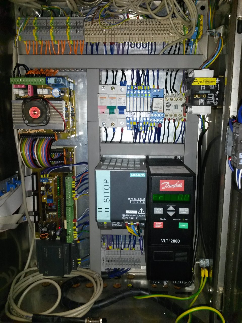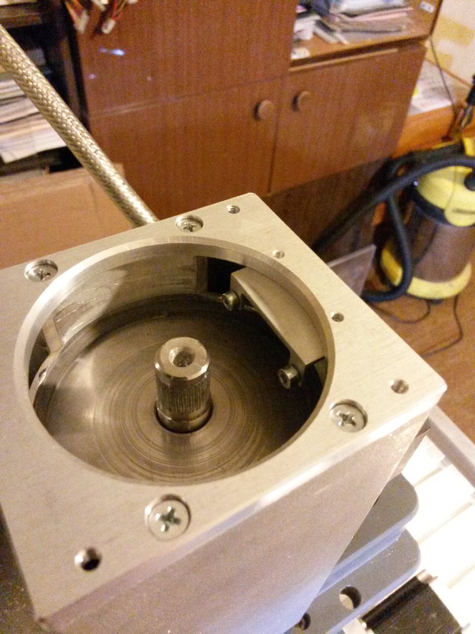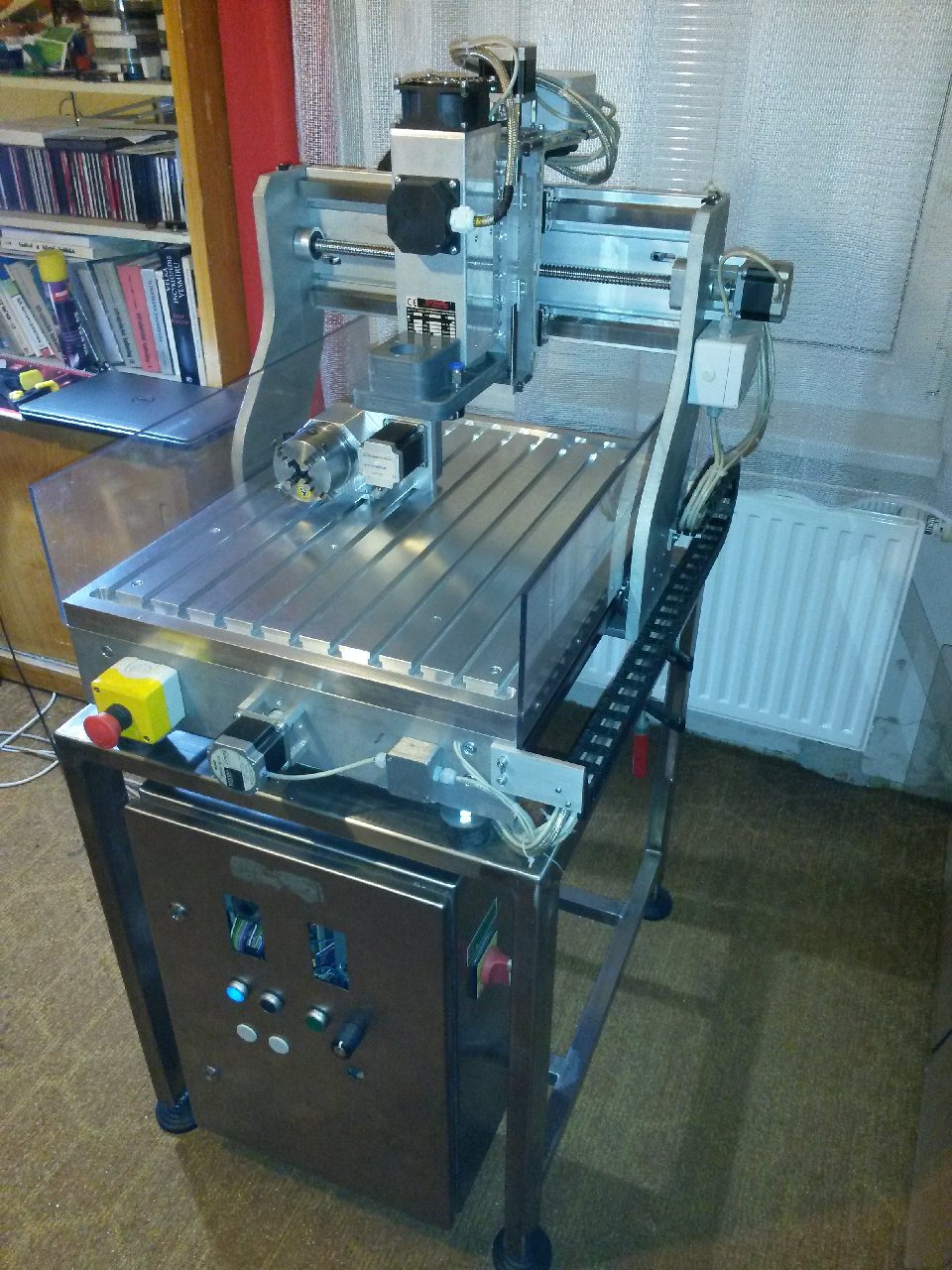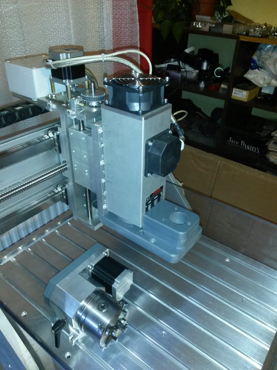 Jinak od dubna kdy jsem prezentoval první fotky stroje tak na něm přibylo několik věcí takže zde dávám pár fotek. Jak už jsem psal výše tak jsem doplnil chlazení ventilátorem a v přírubě která ho drží je už nachystaný držák plošňáku na senzor otáček (né že by byl nutný ale když už je tam na to místo tak proč ne). V rozváděči jsem musel trochu přeházet jednotlivé komponenty tak abych tam dostal frekvenční měnič který je nakonec Danfos VLT 2800 a zároveň na oddělovací desku sem doplnil galvanický oddělený převodník PWM - 0-10V pro řízení otáček měniče (je to prototyp takže ho ještě budu předělávat ale funguje celkem dobře). Další podstatnou změnou byl nový stůl ke kterému jsem dodělal bočnice z plexi a chystám se ještě na odnimatelné přední a zadní čelo. Na vřeteni je namontován držák ke kterému se neodymovými magnety dá připnout smeták na sbírání špon a ze shora se nasadí hadice vysavače, toto ale používám zřídka kdy a většinou jen při opracovávání dřeva. a samozřejmě nemohu zapomenout na dokončenou rotační osu.