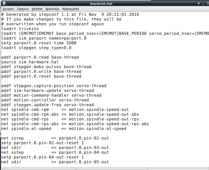 prosím o radu. Mám naistalovaný LinuxCNC 2.7.0 na Debianu. Dříve mě motorky chodily (Ubuntu a nějaká starší verze LinuxuCNC). Teď ne a ne. Když spustím Stepconf tak se motorky točí, ale když spustím LinuxCNC, tak motorky se netočí, ale osy na monitoru jezdí. Můžete mě prosím někdo poradit?
