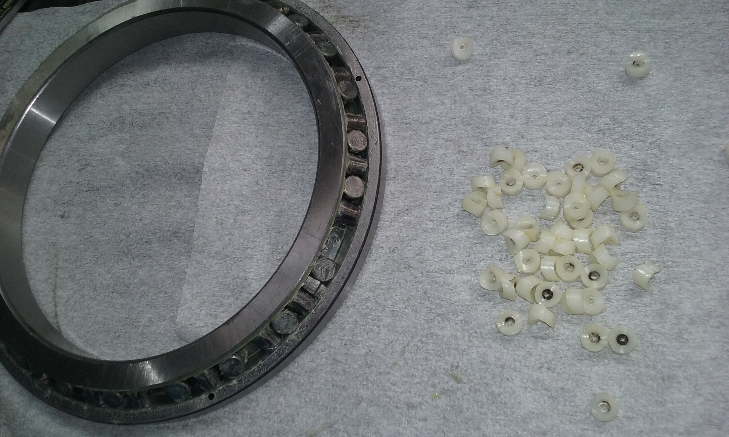tak já to mám bez těch plastovejch čudlíků přímo váleček na válečku.. a po složení mi tam zůstává vůle tak 2-3mm (ložisko průměr cca 200).. ty když to poskládáš s těma plastovejma čudlíkama máš tam taky nějakou vůli? 2-3válečky zahoď a musí se to točit :D