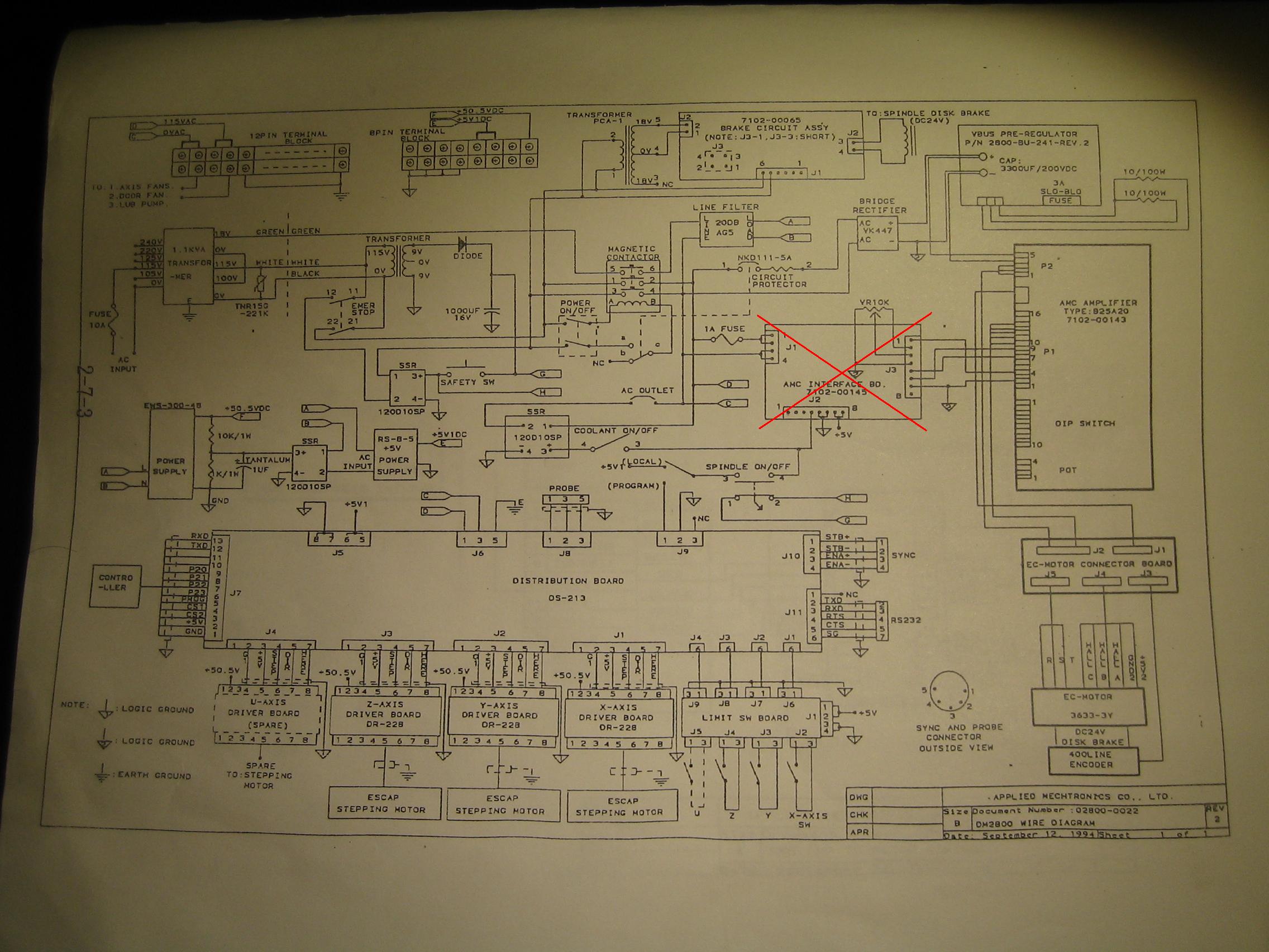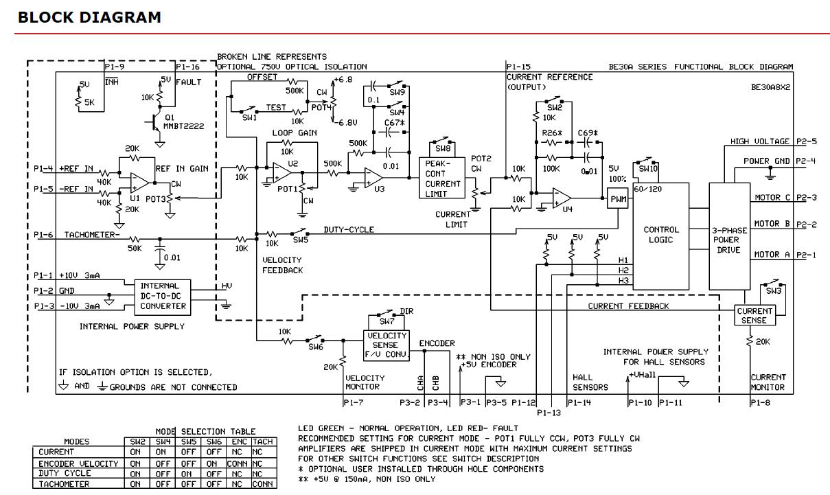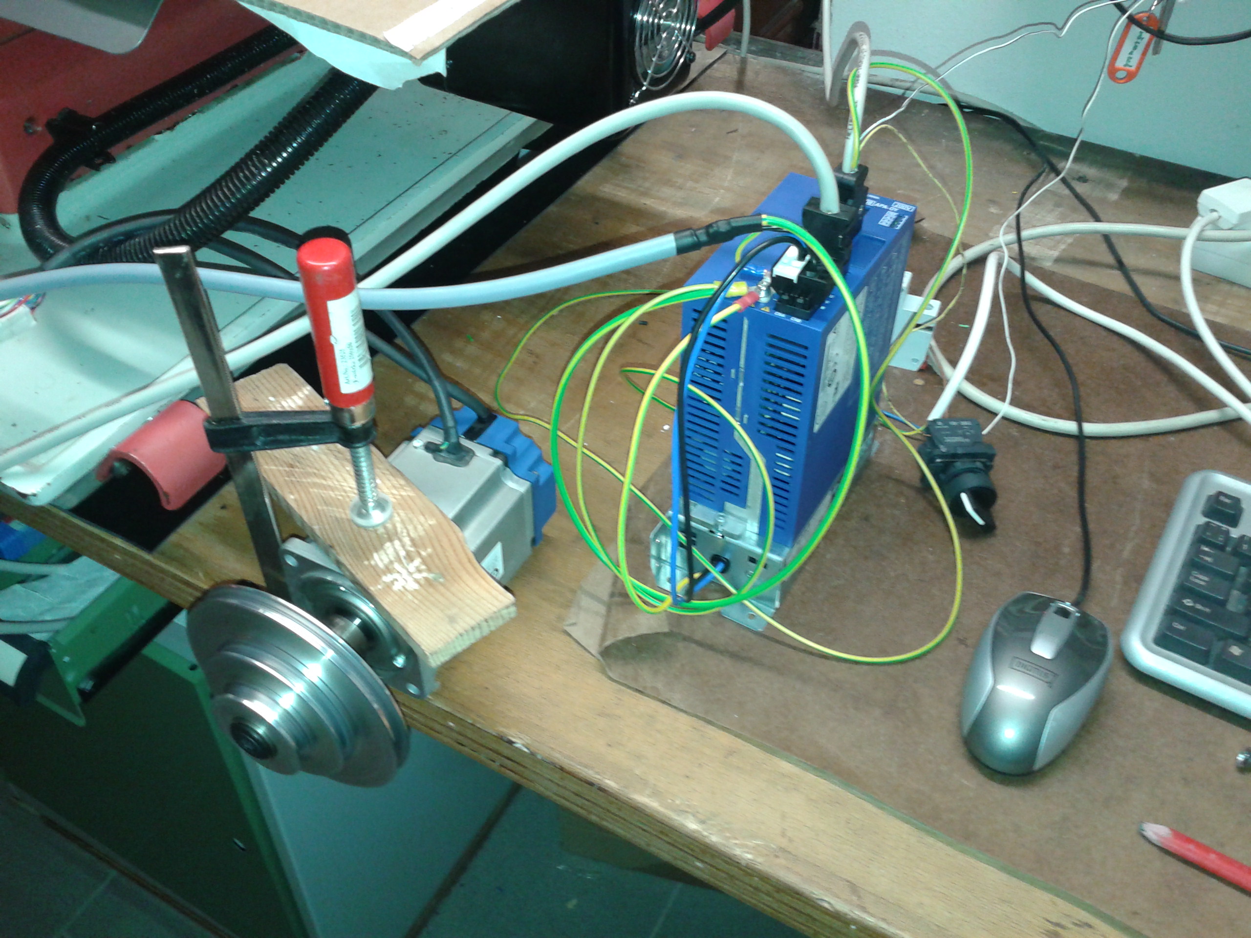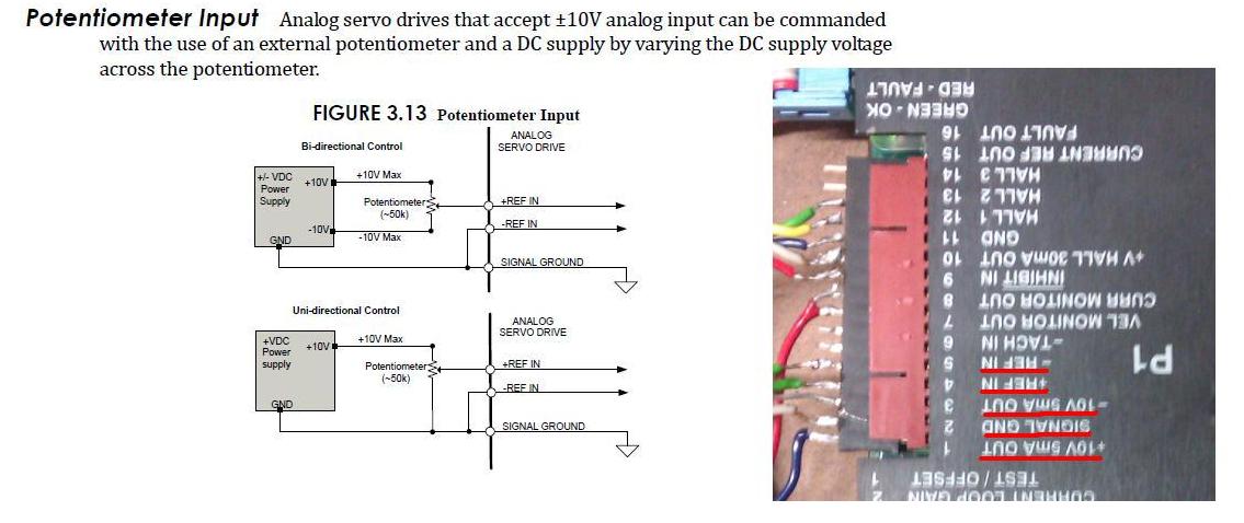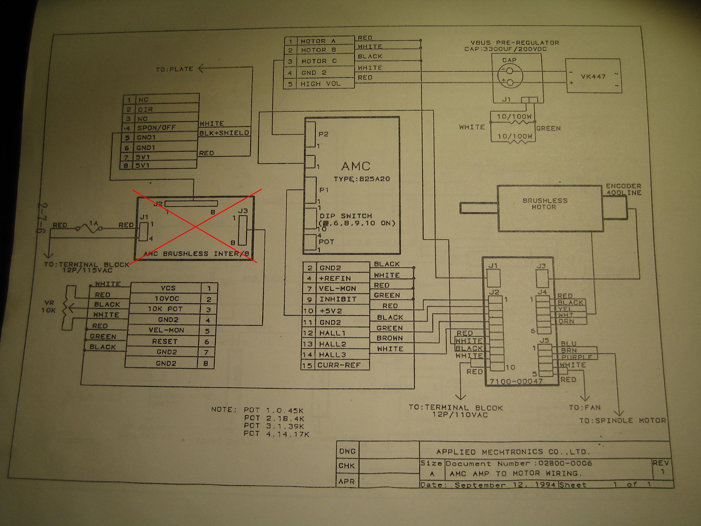 Do instalace jsem zásah dělal, vyřadil jsem desku AMC interface board, která by měla zpracovávat vstupní signál. Pořádně jsem nepochopil, proč tam je. Moje doměnka, že chrání motor před nekontrolovatelnými vysokými otáčky, protože je připojena na Velocity monitor OUTPUT na zesilovači. Při nadlimitních otáčkách prostě vypne motor. Dále zprostředkovávala komunikaci s původním řídícím systémem, ten už nemám, takže to nepotřebuji. Měl jsem v úmyslu desku vyřadit a napojit zesilovač přímo na MESU nebo ruční potenciometr jako napětový komparátor dle výše uvedeného obrázku. To mi fungovalo, ale asi tak 2 hodiny. Když jsem desku zpátky připojil, tak to nešlo ani s deskou a házelo to stejné chyby.