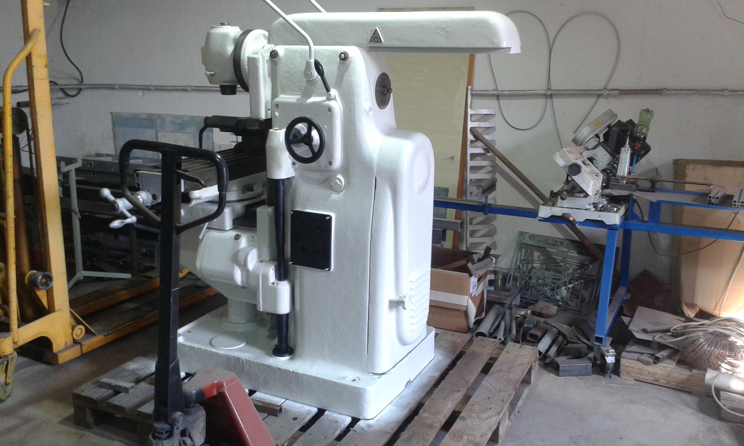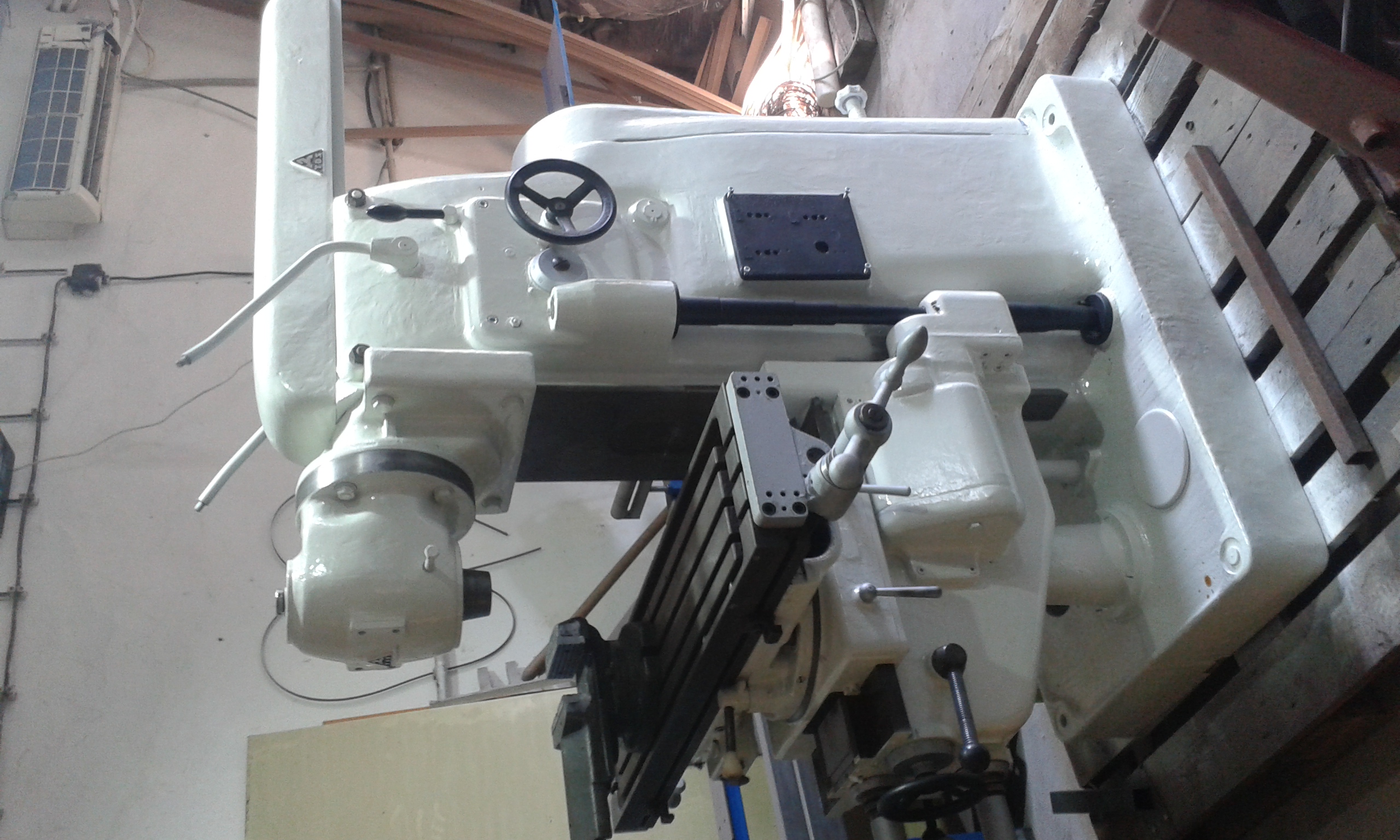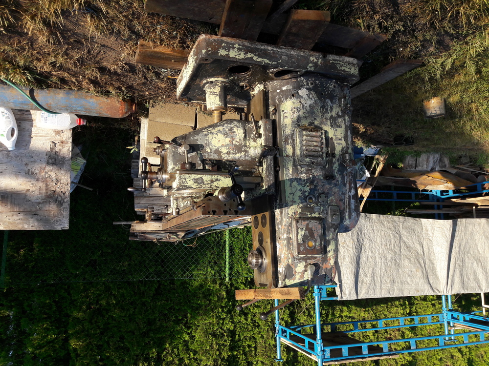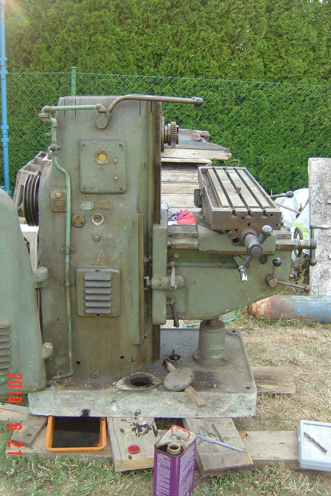 Taky jsem si jí pořídil. Původně jsem o frézce neuvažoval, jenže tahle měla jít do šrotu, tak za u cenu jsem neváhal. Štěstí je, že je ve verzi s rychlostí vřetene 95-1500ot/min. Mám k ní horizontální rameno s ložiskem i vertikální hlavu bez poškozeného soukolí. Převody i strojní pojezdy fungují. Ale je ulomená hřídelka pro ruční kliku veritikálního zdvihu stolu. Vzhledem ke stáří (1938) je v celkem slušném stavu, byla v dílně údržby, posledních 30 nejela. Naštěstí byla tak zmazaná olejem, že není nikde vyrezlá. Původní elektro výstroj jsem pro jistotu zdemontoval.