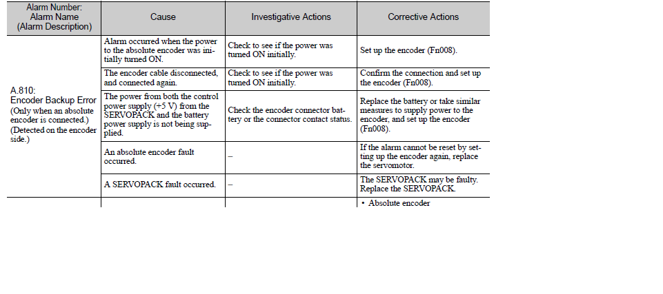 Podle návodu by se měl absolutní enkodér resetovat tak že se stroj cca na 10 minus pustí, pak se vypne a odpojí enkodérový kabel. Na tomto konektoru se pak propojí pin 13 a 14 a měl by se provést reset. Tím by to mělo být ok. Ani by panel neměl být potřeba. Ale ono nic. Pokud zkusím tuto chybu vynulovat přes panel tak se hned po dalším zapnutí opět objeví a jsem tam kde jsem. Baterie má 2.65V tedy tady by neměl být problém. Chybu baterie hlási jinou hláškou až někdy okolo 2.6 voltu. Chyba je A.81 ( absolut encoder alarm ( backup encoder). Tak nevím jestli jsem idiot nebo dělám něco špatně nebo už nevím. Motor je SGMP-08AWMN31 ( pokud by ho náhodou někdo měl a chtěl půjčit budu rád). Driver je SGDB-10ANY11 a platí to samé. Jinač nevím.