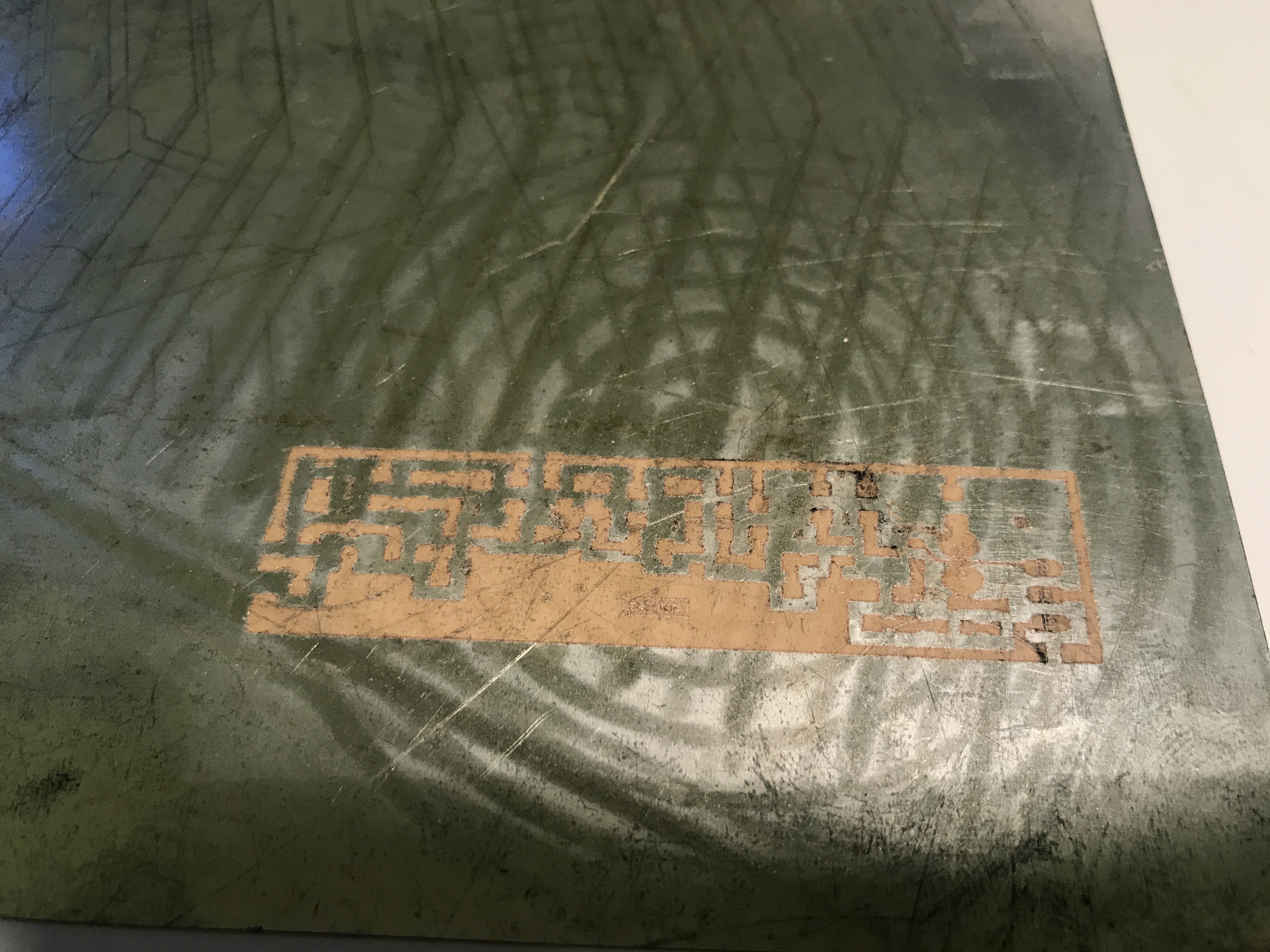 Udělal a použil jsem plošný spoj pro SMD 1206 tak, že jsem na cuprextit napepil tenkou hnědou izolepu a tu jsem mým laserem prořezal.
