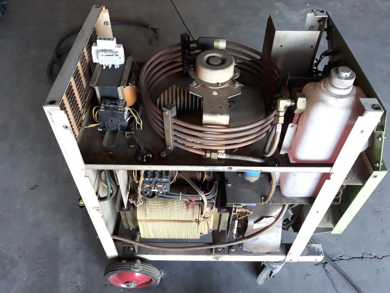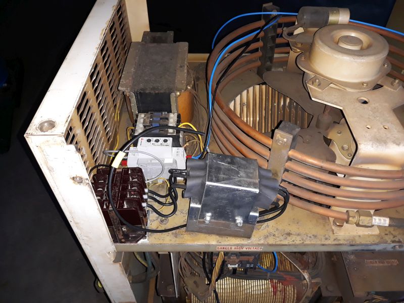 odstrojený zdroj Daihen D12000 takto nejako to tu musím napchať. dolu je vidieť stykač na 50A, ktorý spína hlavné trafo a vyhadzoval ističe. prívodné vodiče ku soft štartu nebudú dlhé. a takto to vyzerá po odskúšaní.