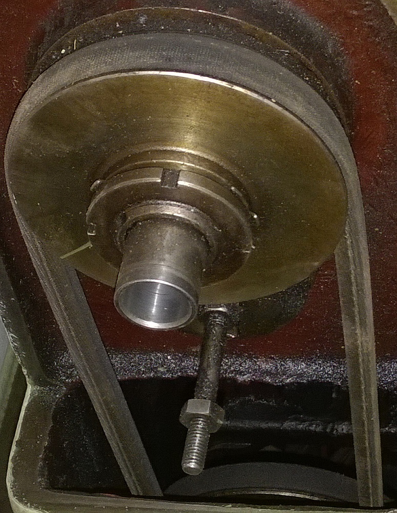 Tak, mašinka už trůní v dílně. Vše okolo posuvu je pryč, horní řemenice vypadá takto