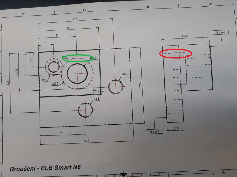 Mě spíše zarazilo zdvojená čara v červeném kolečku a pak po mrknu ti na sousední pohled v zeleném kolečku. Zelené kolečko jsem usoudíl jako sražení, ale červené až ted mi došlo že to jsou j¨hrany dvou děr za sebou. Což není podstatné, ale jde o to ž jsem nějaký čas travil uvažování, člověk co dostané takový výkres taky zauvažuje (ztrati čas), behěm tydné dostané několik výkresu a je z toho pak minuta k minutě, hodina k hodině a práchy tečou.....